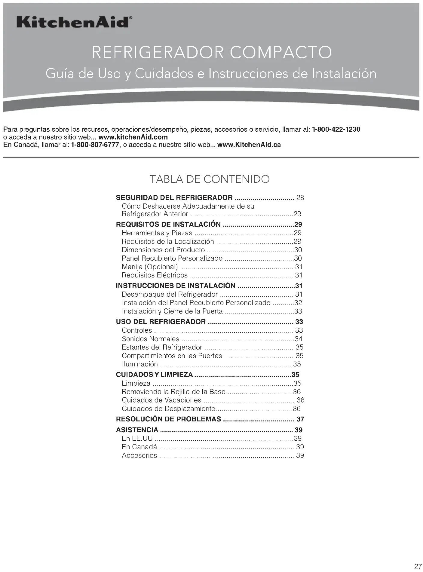 PUERTA Causas Posibles y/o Soluciones Recomendadas Causas Posibles y/o Soluciones Recomendadas La temperatura está demasiado caliente Hay acúmulo de humedad interior Es difícil abrir la puerta La puerta no se cierra completamente ¿Las puertas se abren con frecuencia? Sepa que el refrigerador se calentará cuando eso pasa. Para mantener el refrigerador frío, intente tomar todo lo que necesita del refrigerador de una sola vez. Guarde los alimentos organizados para que sean fáciles de encontrar y cierre la puerta después de retirar los alimentos. ¿Se acaba de añadir una gran cantidad de alimentos al refrigerador? Añadir una gran cantidad de alimentos calienta el refrigerador. El refrigerador puede pasar varias horas en volver a la temperatura normal. ¿Los controles se con guraron correctamente para las condiciones del ambiente? Consulte la sección “Controles”. ¿La rejilla de la base está trabada? Para un mejor desempeño, no instale el refrigerador por detrás de una puerta de alacena ni bloquee la rejilla de la base. ¿Las puertas se abren con frecuencia? Para evitar el acúmulo de humedad, intente tomar todo lo que necesita del refrigerador de una sola vez. Guarde los alimentos organizados para que sean fáciles de encontrar y cierre la puerta después de retirar los alimentos. Cuando la puerta es abierta, la humedad de la habitación entra en el refrigerador. Entre más se abra la puerta, más rápido la humedad se acumula, en especial si la habitación en sí es muy húmeda. ¿Está húmedo? Es normal que la humedad se acumule en el interior del refrigerador cuando el aire está húmedo. ¿Están los alimentos empaquetados correctamente? Compruebe que todos los alimentos estén bien envueltos. Limpie los contenedores de alimento húmedos antes de que se colocan en el refrigerador. ¿Los controles se con guraron correctamente para las condiciones del ambiente? Consulte la sección “Controles”. ¿El empaque está sucio y pegajoso? Limpie la junta y la superfi cie que entra en contacto con ella. Aplique una delgada capa de parafi na sobre la junta después de la limpieza. ¿Los paquetes de alimentos están bloqueando la puerta abierta? Reacomode los contenedores para que se ajusten más y ocupen menos espacio. ¿Las estanterías no están bien posicionadas? Vuelva a insertar las estanterías en sus posiciones correctas. Consulte la sección “Estantes del Refrigerador” para obtener más información. ¿El empaque está pegajoso? Limpie la junta y la superfi cie que entra en contacto con ella. Aplique una delgada capa de parafi na sobre la junta después de la limpieza. Peligro de Explosión Utilice un limpiador no inflamable. No hacerlo podrá resultar en muerte, explosión o incendio.En Canadá Llame al Centro para la eXperiencia del cliente de KitchenAid en Canadá sin costo alguno al: 1-800-807-6777. Nuestros consultores ofrecen ayuda para: Características y especifi caciones de nuestra línea completa de electrodomésticos. Procedimiento para el uso y mantenimiento. Venta de accesorios y partes para reparación. Recomendaciones con distribuidores locales, compañías que dan servicio y distribuidores de partes para reparación. Los técnicos designados por KitchenAid Canada están capacitados para cumplir con la garantía del producto y ofrecer servicio una vez que la garantía termine, en cualquier lugar de Canadá. Para obtener asistencia adicional: Si necesita asistencia adicional, puede escribir a KitchenAid Canada con sus preguntas o dudas a: KitchenAid Canada Customer eXperience Centre 200 – 6750 Century Ave. Mississauga, Ontario L5N 0B7 Por favor incluya en su correspondencia un número de teléfono en el que se le pueda localizar durante el día. Accesorios Los siguientes accesorios están disponibles para su bodega. Para hacer un pedido de un accesorio, contáctenos y pida los números de pieza. En EE.UU., visite nuestro sitio de internet en www.kitchenaid.com/accessories o llame al 1-800-442-9991. En Canadá, visite nuestro sitio de internet en www.whirlpoolparts.ca o llame al 1-800-807-6777. Limpiador de acero inoxidable Pida la pieza No. 4396095