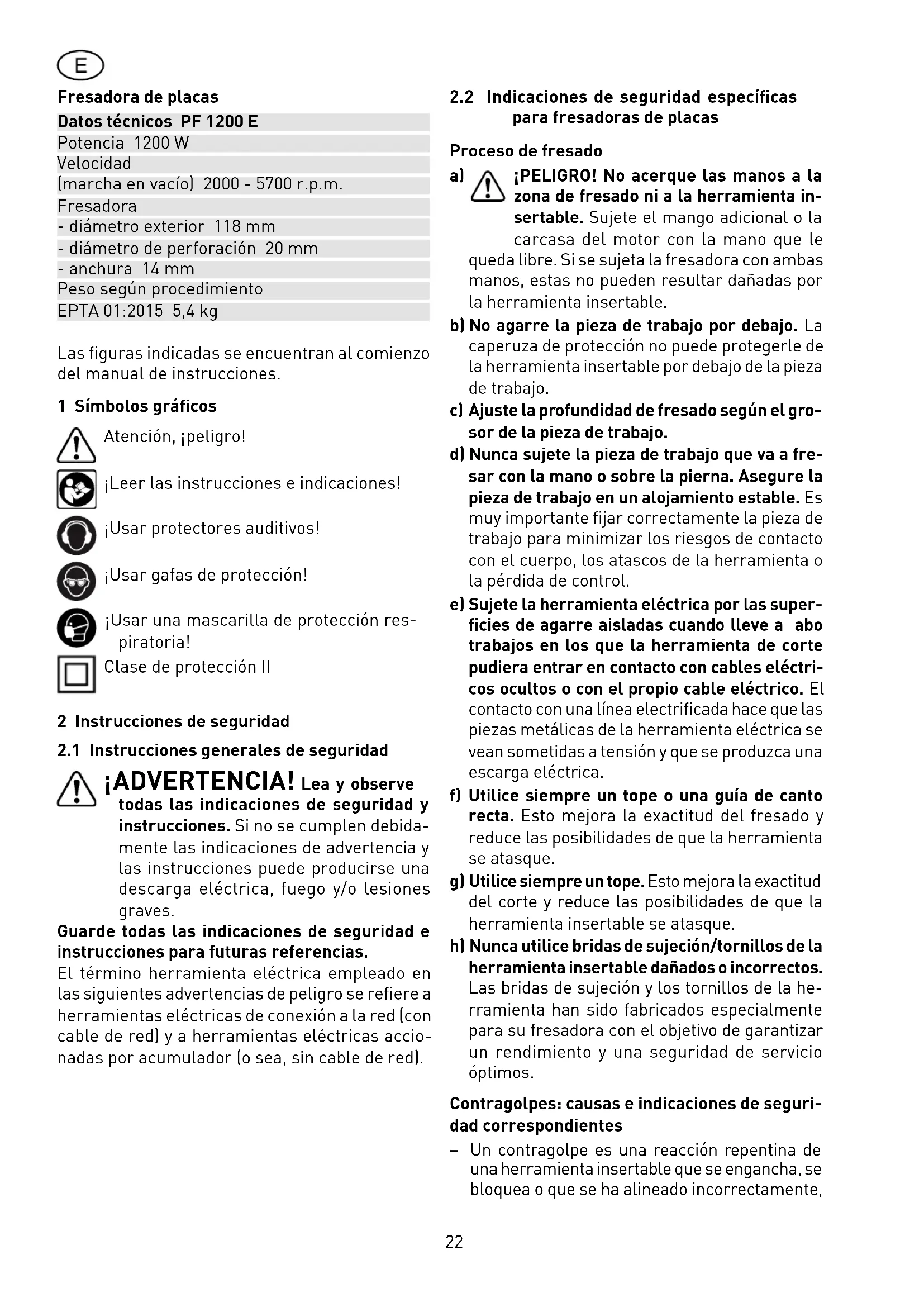¡PELIGRO! No acerque las manos a la zona de fresado ni a la herramienta in- sertable. Sujete el mango adicional o la carcasa del motor con la mano que le queda libre. Si se sujeta la fresadora con ambas manos, estas no pueden resultar dañadas por la herramienta insertable. b) No agarre la pieza de trabajo por debajo. La caperuza de protección no puede protegerle de la herramienta insertable por debajo de la pieza de trabajo. c) Ajuste la profundidad de fresado según el gro- sor de la pieza de trabajo. d) Nunca sujete la pieza de trabajo que va a fre- sar con la mano o sobre la pierna. Asegure la pieza de trabajo en un alojamiento estable. Es muy importante fijar correctamente la pieza de trabajo para minimizar los riesgos de contacto con el cuerpo, los atascos de la herramienta o la pérdida de control. e) Sujete la herramienta eléctrica por las super- ficies de agarre aisladas cuando lleve a abo trabajos en los que la herramienta de corte pudiera entrar en contacto con cables eléctri- cos ocultos o con el propio cable eléctrico. El contacto con una línea electrificada hace que las piezas metálicas de la herramienta eléctrica se vean sometidas a tensión y que se produzca una escarga eléctrica. f) Utilice siempre un tope o una guía de canto recta. Esto mejora la exactitud del fresado y reduce las posibilidades de que la herramienta se atasque. g) Utilice siempre un tope. Esto mejora la exactitud del corte y reduce las posibilidades de que la herramienta insertable se atasque. h) Nunca utilice bridas de sujeción/tornillos de la herramienta insertable dañados o incorrectos. Las bridas de sujeción y los tornillos de la he- rramienta han sido fabricados especialmente para su fresadora con el objetivo de garantizar un rendimiento y una seguridad de servicio óptimos. Contragolpes: causas e indicaciones de seguri- dad correspondientes – Un contragolpe es una reacción repentina de una herramienta insertable que se engancha, se bloquea o que se ha alineado incorrectamente,23 lo cual puede producir que la fresadora se salga de la pieza de trabajo de manera incontrolada y se desvíe hacia el operario; – la hoja de serrar se bloquea al engancharse o atascarse en la ranura de serrado que se va strechando y la fuerza del motor sacude la maquina hacia atrás en dirección al operario; – si la hoja de serrar se tuerce o se alinea inco- rrectamente, los dientes de la parte posterior de la hoja de la sierra pueden engancharse en la superficie de la pieza de trabajo, de manera que la hoja de serrar sale de la ranura y salta hacia atrás en dirección al operario. El contragolpe es la consecuencia de un uso incorrecto o inapropiado de la fresadora. Puede evitarse si se siguen unas medidas de precaución adecuadas como las que se describen a conti- nuación. a) Sujete la fresadora con ambas manos y colo- que los brazos de tal modo que le permitan hacer frente a la fuerza de un posible contra- golpe. Colóquese siempre en un lateral de la herramienta insertable, no la sitúe en ningún caso en línea con su cuerpo. En caso de con- tragolpe la fresadora puede saltar hacia atrás; sin embargo, la fuerza del contragolpe puede ser controlada por el operario aplicando unas medidas adecuadas. b) Si se atasca la herramienta o si interrumpe el trabajo, apague la fresadora y sosténgala en el material hasta que la herramienta se detenga. No intente retirar la fresadora de la pieza de trabajo o tirar de la fresadora hacia atrás mientras la herramienta insertable se esté moviendo, puesto que podría producirse un contragolpe. Determinar la causa del atasco de la herramienta insertable y solucionarla. c) Cuando desee reanudar el trabajo con una fre- sadora que ya se encuentra dentro de una pieza de trabajo, centre la herramienta insertable en la ranura de serrado y compruebe que los dientes de la sierra no se hayan enganchado en la pieza de trabajo. Si la herramienta inser- table se hubiera enganchado, puede salirse de la pieza de trabajo u ocasionar un contragolpe al volver a arrancar la fresadora. d) Cuando trabaje con paneles grandes, apuntále- los para evitar que se produzca un contragolpe al engancharse una herramienta insertable. Los paneles grandes pueden combarse por su propio peso. Los paneles deben apuntalarse por ambos lados, tanto cerca de la ranura como en el canto. e) No utilizar herramientas desafiladas o defec- tuosas. Las herramientas con dientes romos o mal alineados producen, a causa de una ranura demasiado estrecha, un rozamiento mayor, el bloqueo de la herramienta y contragolpes. f) Antes de comenzar a fresar, fije los ajustes de la profundidad y el ángulo de fresado. Si durante las tareas de fresado se modifican los ajustes, la herramienta puede bloquearse y podría causar un contragolpe. g) Tenga especial precaución al fresar en muros o en otras zonas que no pueda examinar. La fresadora que realiza la incisión puede blo- quearse al fresar objetos ocultos y causar un contragolpe. Función de la caperuza inferior de protección a) Compruebe el estado y el funcionamiento del resorte de la caperuza de protección. No utilice la fresadora si la caperuza de protección y el resorte no funcionan correctamente. Las pie- zas dañadas, los residuos pegajosos o la acu- mulación de virutas hacen que la caperuza de protección inferior funcione de forma retardada.