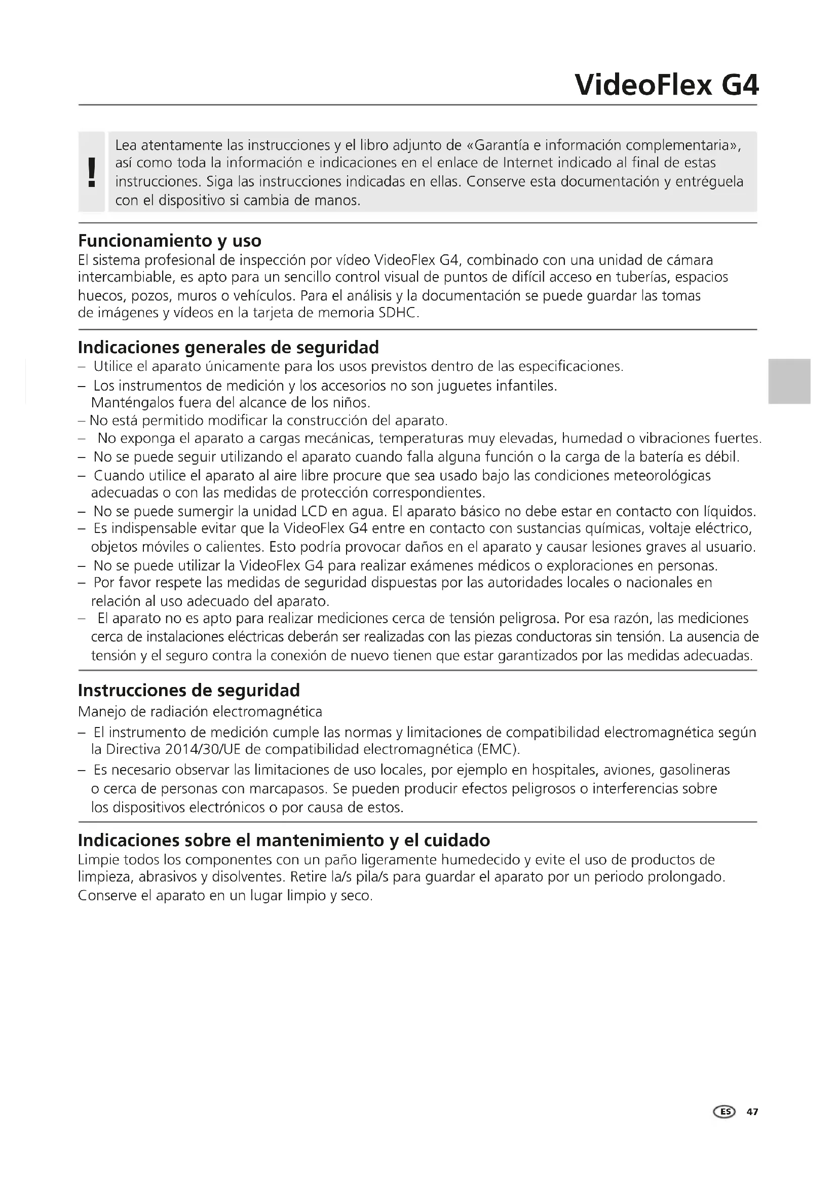 Funcionamiento y uso El sistema profesional de inspección por vídeo VideoFlex G4, combinado con una unidad de cámara intercambiable, es apto para un sencillo control visual de puntos de difícil acceso en tuberías, espacios huecos, pozos, muros o vehículos. Para el análisis y la documentación se puede guardar las tomas de imágenes y vídeos en la tarjeta de memoria SDHC. Indicaciones generales de seguridad – Utilice el aparato únicamente para los usos previstos dentro de las especicaciones. – Los instrumentos de medición y los accesorios no son juguetes infantiles. Manténgalos fuera del alcance de los niños. – No está permitido modicar la construcción del aparato. – No exponga el aparato a cargas mecánicas, temperaturas muy elevadas, humedad o vibraciones fuertes. – No se puede seguir utilizando el aparato cuando falla alguna función o la carga de la batería es débil. – Cuando utilice el aparato al aire libre procure que sea usado bajo las condiciones meteorológicas adecuadas o con las medidas de protección correspondientes. – No se puede sumergir la unidad LCD en agua. El aparato básico no debe estar en contacto con líquidos. – Es indispensable evitar que la VideoFlex G4 entre en contacto con sustancias químicas, voltaje eléctrico, objetos móviles o calientes. Esto podría provocar daños en el aparato y causar lesiones graves al usuario. – No se puede utilizar la VideoFlex G4 para realizar exámenes médicos o exploraciones en personas. – Por favor respete las medidas de seguridad dispuestas por las autoridades locales o nacionales en relación al uso adecuado del aparato. – El aparato no es apto para realizar mediciones cerca de tensión peligrosa. Por esa razón, las mediciones cerca de instalaciones eléctricas deberán ser realizadas con las piezas conductoras sin tensión. La ausencia de tensión y el seguro contra la conexión de nuevo tienen que estar garantizados por las medidas adecuadas. Instrucciones de seguridad Manejo de radiación electromagnética – El instrumento de medición cumple las normas y limitaciones de compatibilidad electromagnética según la Directiva 2014/30/UE de compatibilidad electromagnética (EMC). – Es necesario observar las limitaciones de uso locales, por ejemplo en hospitales, aviones, gasolineras o cerca de personas con marcapasos. Se pueden producir efectos peligrosos o interferencias sobre los dispositivos electrónicos o por causa de estos. Indicaciones sobre el mantenimiento y el cuidado Limpie todos los componentes con un paño ligeramente humedecido y evite el uso de productos de limpieza, abrasivos y disolventes. Retire la/s pila/s para guardar el aparato por un periodo prolongado. Conserve el aparato en un lugar limpio y seco. ES48