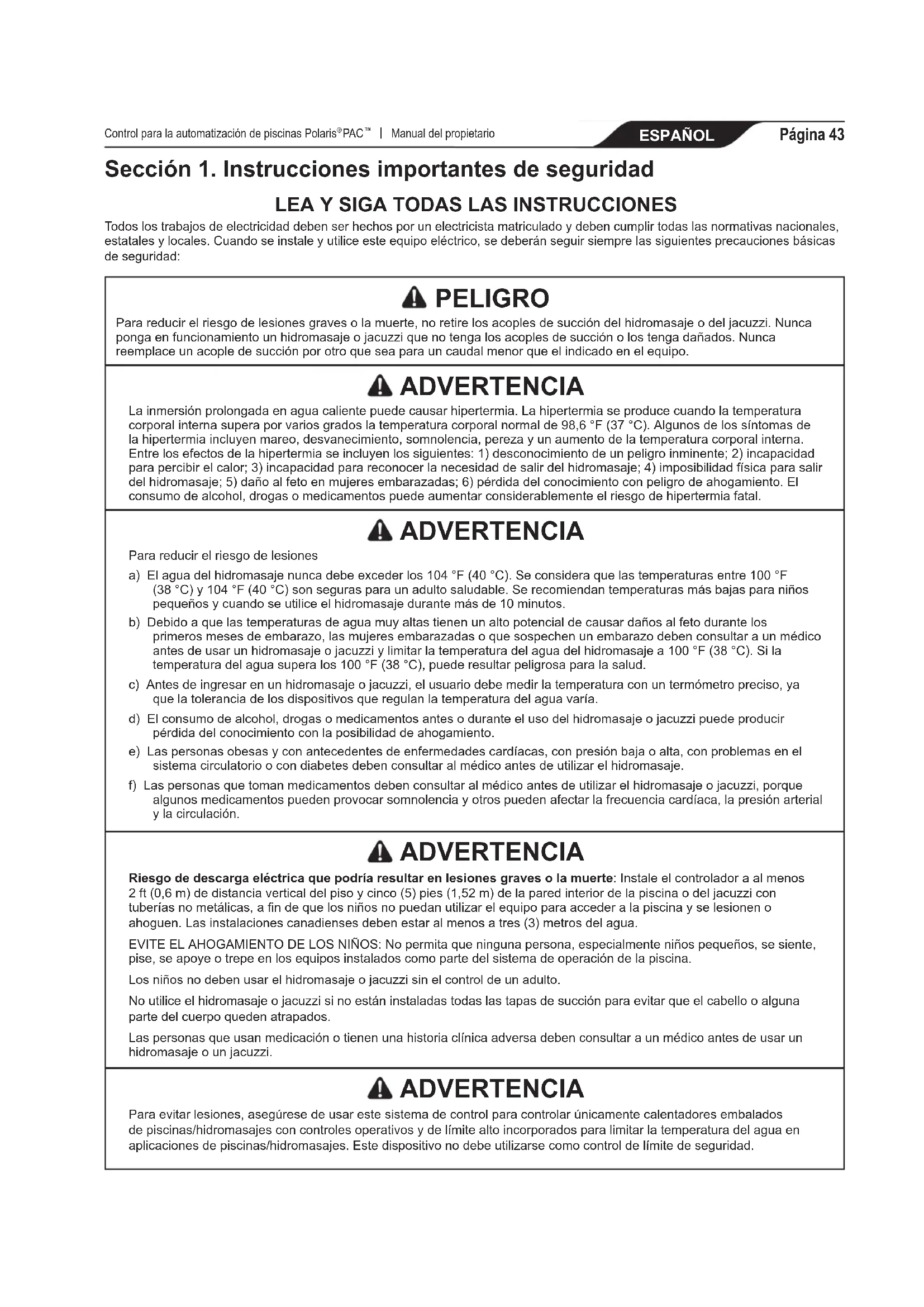 Todos los trabajos de electricidad deben ser hechos por un electricista matriculado y deben cumplir todas las normativas nacionales, estatales y locales. Cuando se instale y utilice este equipo eléctrico, se deberán seguir siempre las siguientes precauciones básicas de seguridad: PELIGRO Para reducir el riesgo de lesiones graves o la muerte, no retire los acoples de succión del hidromasaje o del jacuzzi. Nunca ponga en funcionamiento un hidromasaje o jacuzzi que no tenga los acoples de succión o los tenga dañados. Nunca reemplace un acople de succión por otro que sea para un caudal menor que el indicado en el equipo. ADVERTENCIA La inmersión prolongada en agua caliente puede causar hipertermia. La hipertermia se produce cuando la temperatura corporal interna supera por varios grados la temperatura corporal normal de 98,6 °F (37 °C). Algunos de los síntomas de la hipertermia incluyen mareo, desvanecimiento, somnolencia, pereza y un aumento de la temperatura corporal interna. Entre los efectos de la hipertermia se incluyen los siguientes: 1) desconocimiento de un peligro inminente; 2) incapacidad para percibir el calor; 3) incapacidad para reconocer la necesidad de salir del hidromasaje; 4) imposibilidad física para salir del hidromasaje; 5) daño al feto en mujeres embarazadas; 6) pérdida del conocimiento con peligro de ahogamiento. El consumo de alcohol, drogas o medicamentos puede aumentar considerablemente el riesgo de hipertermia fatal. ADVERTENCIA Para reducir el riesgo de lesionesa) El agua del hidromasaje nunca debe exceder los 104 °F (40 °C). Se considera que las temperaturas entre 100 °F (38 °C) y 104 °F (40 °C) son seguras para un adulto saludable. Se recomiendan temperaturas más bajas para niños pequeños y cuando se utilice el hidromasaje durante más de 10 minutos.b) Debido a que las temperaturas de agua muy altas tienen un alto potencial de causar daños al feto durante los primeros meses de embarazo, las mujeres embarazadas o que sospechen un embarazo deben consultar a un médico antes de usar un hidromasaje o jacuzzi y limitar la temperatura del agua del hidromasaje a 100 °F (38 °C). Si la temperatura del agua supera los 100 °F (38 °C), puede resultar peligrosa para la salud.c) Antes de ingresar en un hidromasaje o jacuzzi, el usuario debe medir la temperatura con un termómetro preciso, ya que la tolerancia de los dispositivos que regulan la temperatura del agua varía.d) El consumo de alcohol, drogas o medicamentos antes o durante el uso del hidromasaje o jacuzzi puede producir pérdida del conocimiento con la posibilidad de ahogamiento.e) Las personas obesas y con antecedentes de enfermedades cardíacas, con presión baja o alta, con problemas en el sistema circulatorio o con diabetes deben consultar al médico antes de utilizar el hidromasaje.f) Las personas que toman medicamentos deben consultar al médico antes de utilizar el hidromasaje o jacuzzi, porque algunos medicamentos pueden provocar somnolencia y otros pueden afectar la frecuencia cardíaca, la presión arterial y la circulación. ADVERTENCIA Riesgo de descarga eléctrica que podría resultar en lesiones graves o la muerte: Instale el controlador a al menos 2 ft (0,6 m) de distancia vertical del piso y cinco (5) pies (1,52 m) de la pared interior de la piscina o del jacuzzi con tuberías no metálicas, a n de que los niños no puedan utilizar el equipo para acceder a la piscina y se lesionen o ahoguen. Las instalaciones canadienses deben estar al menos a tres (3) metros del agua.EVITE EL AHOGAMIENTO DE LOS NIÑOS: No permita que ninguna persona, especialmente niños pequeños, se siente, pise, se apoye o trepe en los equipos instalados como parte del sistema de operación de la piscina.Los niños no deben usar el hidromasaje o jacuzzi sin el control de un adulto. No utilice el hidromasaje o jacuzzi si no están instaladas todas las tapas de succión para evitar que el cabello o alguna parte del cuerpo queden atrapados.Las personas que usan medicación o tienen una historia clínica adversa deben consultar a un médico antes de usar un hidromasaje o un jacuzzi. ADVERTENCIA Para evitar lesiones, asegúrese de usar este sistema de control para controlar únicamente calentadores embalados de piscinas/hidromasajes con controles operativos y de límite alto incorporados para limitar la temperatura del agua en aplicaciones de piscinas/hidromasajes. Este dispositivo no debe utilizarse como control de límite de seguridad.ESPAÑOL Control para la automatización de piscinas Polaris