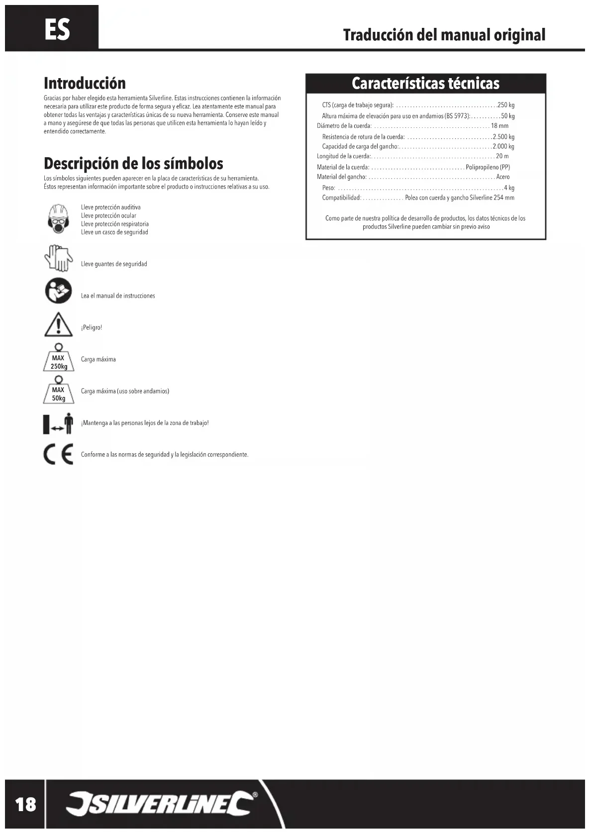 CTS (carga de trabajo segura): .....................................250 kg Altura máxima de elevación para uso en andamios (BS 5973):...........50 kg Diámetro de la cuerda: ..........................................18 mm Resistencia de rotura de la cuerda: ...............................2.500 kg Capacidad de carga del gancho:..................................2.000 kg Longitud de la cuerda:.............................................20 m Material de la cuerda: ..................................Polipropileno (PP) Material del gancho: ..............................................Acero Peso: ............................................................4 kg Compatibilidad: ...............Polea con cuerda y gancho Silverline 254 mm Como parte de nuestra política de desarrollo de productos, los datos técnicos de los productos Silverline pueden cambiar sin previo aviso Introducción Gracias por haber elegido esta herramienta Silverline. Estas instrucciones contienen la información necesaria para utilizar este producto de forma segura y ecaz. Lea atentamente este manual para obtener todas las ventajas y características únicas de su nueva herramienta. Conserve este manual a mano y asegúrese de que todas las personas que utilicen esta herramienta lo hayan leído y entendido correctamente. Características técnicas MAX 250kg MAX 50kg 865628_Manual.indd 18 19/07/2018 14:41Cuerda con gancho para polea865628