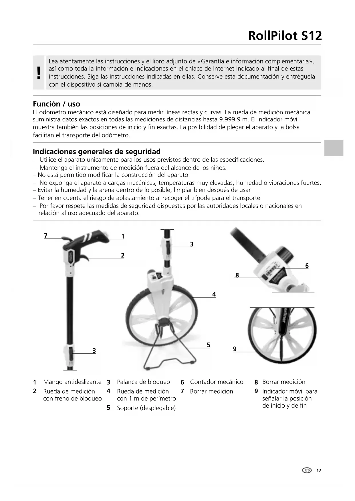 Función / uso El odómetro mecánico está diseñado para medir líneas rectas y curvas. La rueda de medición mecánica suministra datos exactos en todas las mediciones de distancias hasta 9.999,9 m. El indicador móvil muestra también las posiciones de inicio y n exactas. La posibilidad de plegar el aparato y la bolsa facilitan el transporte del odómetro. Indicaciones generales de seguridad – Utilice el aparato únicamente para los usos previstos dentro de las especicaciones. – Mantenga el instrumento de medición fuera del alcance de los niños. – No está permitido modicar la construcción del aparato. – No exponga el aparato a cargas mecánicas, temperaturas muy elevadas, humedad o vibraciones fuertes. – Evitar la humedad y la arena dentro de lo posible, limpiar bien después de usar – Tener en cuenta el riesgo de aplastamiento al recoger el trípode para el transporte – Por favor respete las medidas de seguridad dispuestas por las autoridades locales o nacionales en relación al uso adecuado del aparato.