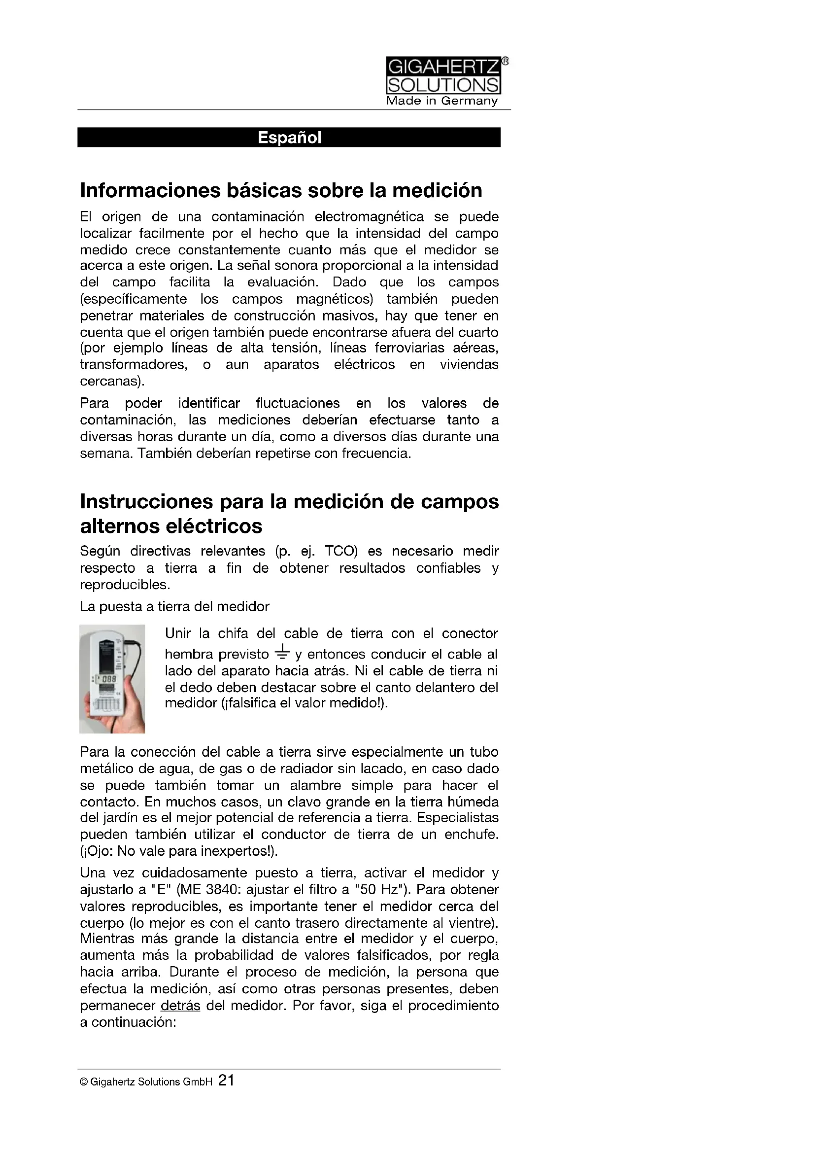 Baterías, Auto-Power-Off, Low batt. El medidor funciona con bloques de baterías de 9 V. El compartimento de baterías se encuentra en el dorso en la parte inferior del aparato. El medidor se desactiva automáticamente después de un tiempo de funcionamiento de aproximadamente 40 minutos para proteger la capacidad de la batería. Si la pantalla indica “Low. Batt.”, el aparato ya se desactiva después de aproximadamente 3 minutos. En este caso no se puede garantizar una medición fiable.Made in Germany © Gigahertz Solutions GmbH 25 Medidas para una reducción de la contaminación Si es posible: ¡Alejarse del origen del campo! “Conectar con fases correctas” Con este fin, ajustar el medidor a "E" y ponerlo entre ejem. la veladora y el cabezal. Apagar la luz. Notar o memorizar el valor indicado. Desconectar el enchufe y conectarlo nuevamente después de haberlo volteado 180°. Lógico: Dejar el enchufe en la posición con el campo menor. Este truco funciona mejor si la lámpara tiene el conmutador integrado en el conducto. Utilizar tanto regletas de enchufe blindadas con conmutador bipolar como conducciones de conexión a la red blindadas (¡véase el sitio web!). Instalar un interruptor de red: Este se instala en la caja de fusibles y desconecta el circuito correspondiente automáticamente de la red en cuanto se apague el último consumidor. El circuito así desconectado ya no se encuentra bajo tensión, y por eso ya no puede causar campos eléctricos. Esta medida frecuentemente es la que tiene la mejor proporción entre gastos y beneficios, y por eso es la opción muchas veces tomada como medida de saneamiento por parte de los expertos de la biología de construcción. Los interruptores de red innovadores de Gigahertz Solutions se encuentran en muchas listas de recomendación (véase también www.gigahertz- solutions.de). La cuestión si un interruptor de red sea una inversión razonable en el caso suyo, Ud. lo puede determinar (es recomendable hacerlo entre dos personas): Una persona lee los valores indicados en el medidor sobre la cama donde usualmente se encuentra la cabeza (medidor ajustado a “E”) La otra persona apaga el fusible correspondiente, y en caso de ser necesario también los fusibles de los circuitos inmediatos. Es aconsejable instalar un interruptor de red en los circuitos que muestran una reducción de la contaminación. Informaciones adicionales, así como literatura y contactos a expertos de la biología de construcción pueden encontrarse en nuestro sitio web.Made in Germany © Gigahertz Solutions GmbH, D-90579 Langenzenn