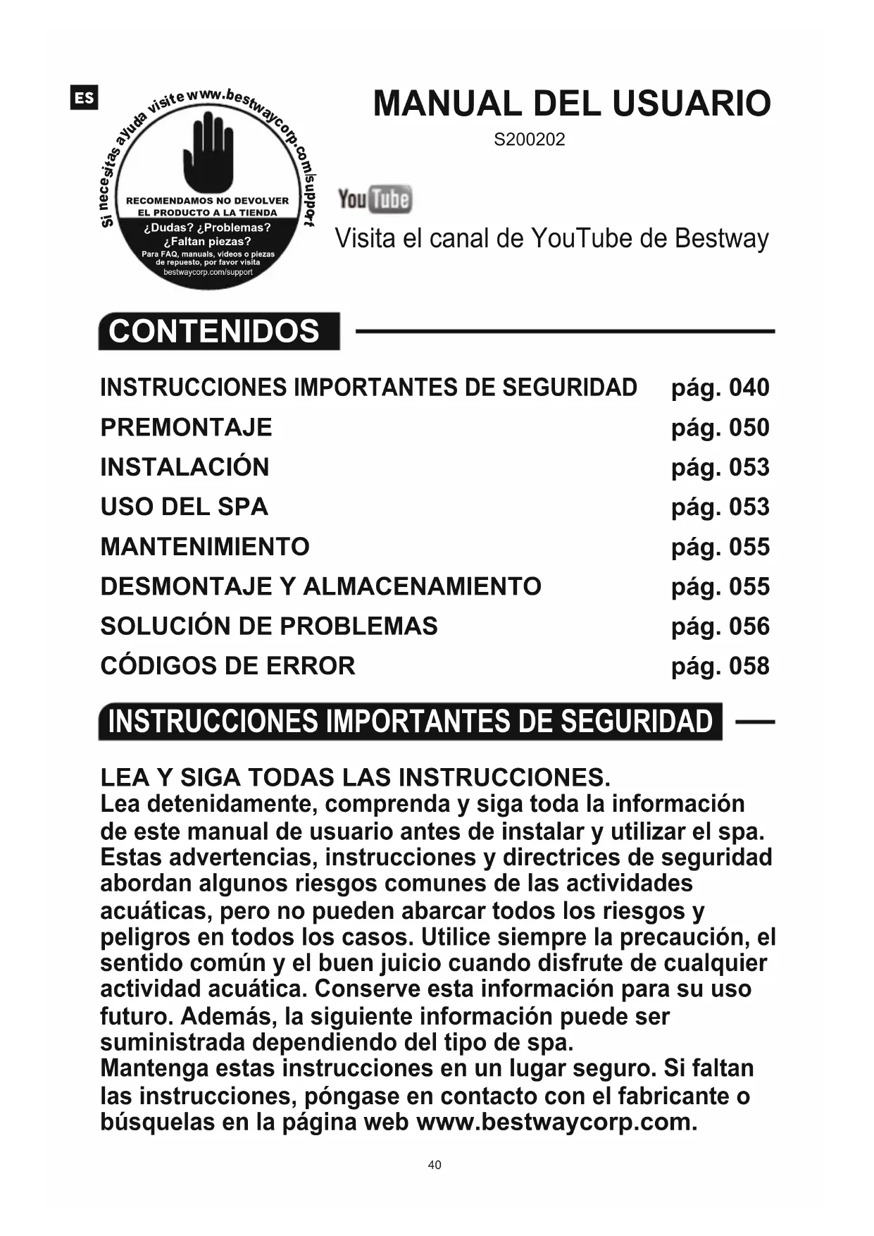 www.bestwaycorp.com. Eletricidade detetada no fio terra.INSTRUCCIONES IMPORTANTES DE SEGURIDAD LEA Y SIGA TODAS LAS INSTRUCCIONES. Lea detenidamente, comprenda y siga toda la información de este manual de usuario antes de instalar y utilizar el spa. Estas advertencias, instrucciones y directrices de seguridad abordan algunos riesgos comunes de las actividades acuáticas, pero no pueden abarcar todos los riesgos y peligros en todos los casos. Utilice siempre la precaución, el sentido común y el buen juicio cuando disfrute de cualquier actividad acuática. Conserve esta información para su uso futuro. Además, la siguiente información puede ser suministrada dependiendo del tipo de spa. Mantenga estas instrucciones en un lugar seguro. Si faltan las instrucciones, póngase en contacto con el fabricante o búsquelas en la página web www.bestwaycorp.com.