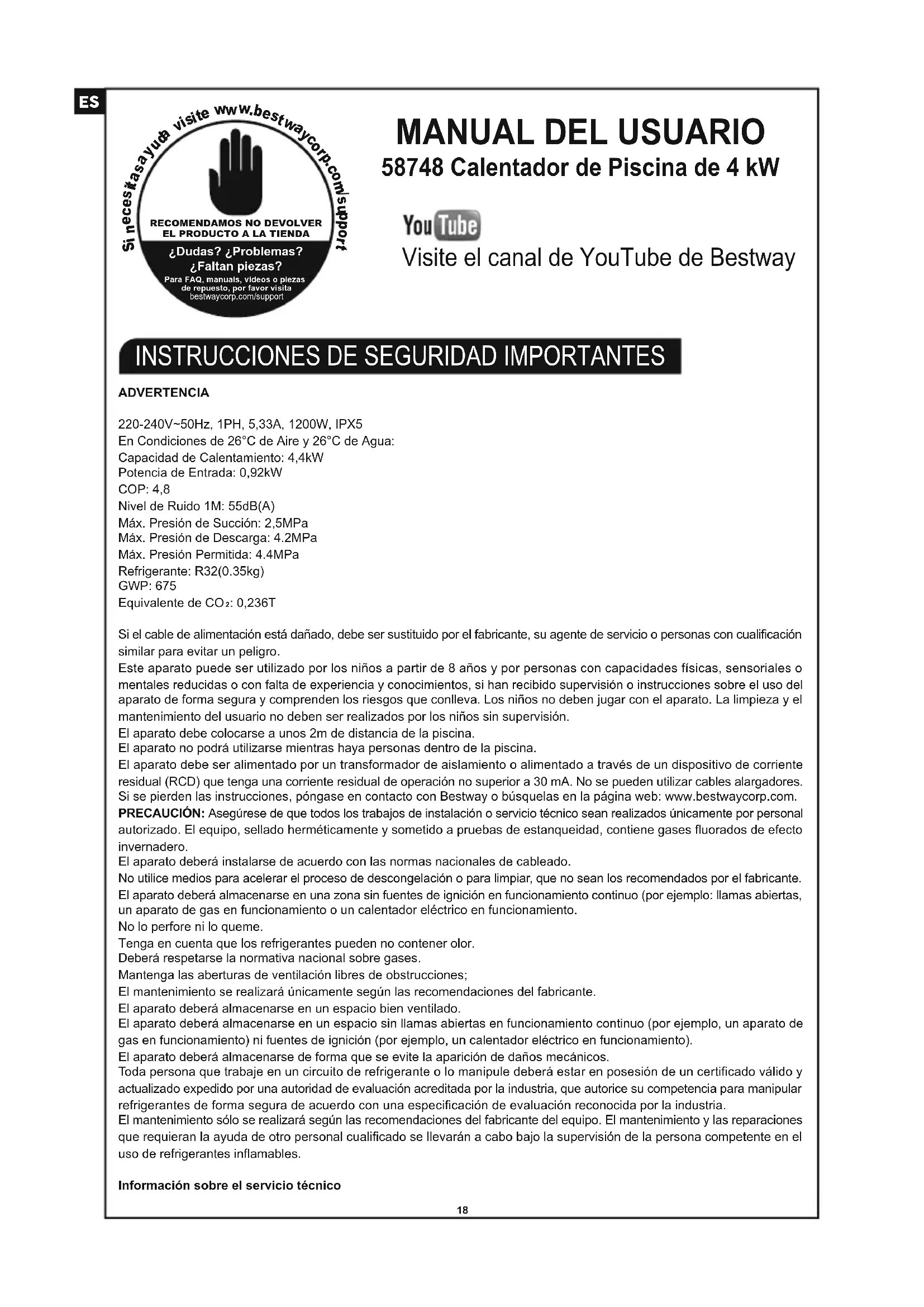 Y/GN Amb. Temp.Inlet Temp.Coil Temp. ReactorADVERTENCIA220-240V~50Hz, 1PH, 5,33A, 1200W, IPX5En Condiciones de 26°C de Aire y 26°C de Agua: Capacidad de Calentamiento: 4,4kWPotencia de Entrada: 0,92kW COP: 4,8Nivel de Ruido 1M: 55dB(A)Máx. Presión de Succión: 2,5MPa Máx. Presión de Descarga: 4.2MPa Máx. Presión Permitida: 4.4MPa Refrigerante: R32(0.35kg)GWP: 675Equivalente de CO : 0,236T Si el cable de alimentación está dañado, debe ser sustituido por el fabricante, su agente de servicio o personas con cualificación similar para evitar un peligro.Este aparato puede ser utilizado por los niños a partir de 8 años y por personas con capacidades físicas, sensoriales o mentales reducidas o con falta de experiencia y conocimientos, si han recibido supervisión o instrucciones sobre el uso del aparato de forma segura y comprenden los riesgos que conlleva. Los niños no deben jugar con el aparato. La limpieza y el mantenimiento del usuario no deben ser realizados por los niños sin supervisión.El aparato debe colocarse a unos 2m de distancia de la piscina. El aparato no podrá utilizarse mientras haya personas dentro de la piscina.El aparato debe ser alimentado por un transformador de aislamiento o alimentado a través de un dispositivo de corriente residual (RCD) que tenga una corriente residual de operación no superior a 30 mA. No se pueden utilizar cables alargadores. Si se pierden las instrucciones, póngase en contacto con Bestway o búsquelas en la página web: www.bestwaycorp.com. PRECAUCIÓN: Asegúrese de que todos los trabajos de instalación o servicio técnico sean realizados únicamente por personal autorizado. El equipo, sellado herméticamente y sometido a pruebas de estanqueidad, contiene gases fluorados de efecto invernadero.El aparato deberá instalarse de acuerdo con las normas nacionales de cableado. No utilice medios para acelerar el proceso de descongelación o para limpiar, que no sean los recomendados por el fabricante. El aparato deberá almacenarse en una zona sin fuentes de ignición en funcionamiento continuo (por ejemplo: llamas abiertas, un aparato de gas en funcionamiento o un calentador eléctrico en funcionamiento. No lo perfore ni lo queme.Tenga en cuenta que los refrigerantes pueden no contener olor.Deberá respetarse la normativa nacional sobre gases.Mantenga las aberturas de ventilación libres de obstrucciones;El mantenimiento se realizará únicamente según las recomendaciones del fabricante.El aparato deberá almacenarse en un espacio bien ventilado.El aparato deberá almacenarse en un espacio sin llamas abiertas en funcionamiento continuo (por ejemplo, un aparato de gas en funcionamiento) ni fuentes de ignición (por ejemplo, un calentador eléctrico en funcionamiento).El aparato deberá almacenarse de forma que se evite la aparición de daños mecánicos. Toda persona que trabaje en un circuito de refrigerante o lo manipule deberá estar en posesión de un certificado válido y actualizado expedido por una autoridad de evaluación acreditada por la industria, que autorice su competencia para manipular refrigerantes de forma segura de acuerdo con una especificación de evaluación reconocida por la industria. El mantenimiento sólo se realizará según las recomendaciones del fabricante del equipo. El mantenimiento y las reparaciones que requieran la ayuda de otro personal cualificado se llevarán a cabo bajo la supervisión de la persona competente en el uso de refrigerantes inflamables.Información sobre el servicio técnico Controles en la zona Antes de comenzar a trabajar en sistemas que contengan refrigerantes inflamables, es necesario realizar comprobaciones de seguridad para garantizar que se minimiza el riesgo de ignición. Para la reparación del sistema de refrigeración, deberán cumplirse las siguientes precauciones antes de realizar los trabajos en el sistema.Procedimiento de trabajo El trabajo se llevará a cabo bajo un procedimiento controlado para minimizar el riesgo de presencia de un gas o vapor inflamable mientras se realiza el trabajo.Zona general de trabajo Todo el personal de mantenimiento y otras personas que trabajen en la zona deberán ser instruidos sobre la naturaleza del trabajo que se está realizando. Se evitará trabajar en espacios confinados. El área alrededor del espacio de trabajo deberá ser seccionada. Asegúrese de que las condiciones dentro del área se han hecho seguras mediante el control del material inflamable. Comprobación de la presencia de refrigerante Se comprobará la zona con un detector de refrigerantes adecuado antes y durante el trabajo, para asegurarse de que el técnico es consciente de la existencia de atmósferas potencialmente inflamables. Asegúrese de que el equipo de detección de fugas que se utilice sea adecuado para su uso con refrigerantes inflamables, es decir, que no produzca chispas, que esté adecuadamente sellado o que sea intrínsecamente seguro.Presencia de un extintor de incendios Si se va a realizar algún trabajo en caliente en el equipo de refrigeración o en cualquiera de sus partes asociadas, deberá tener a mano el equipo de extinción de incendios adecuado. Tenga un extintor de polvo seco o de CO 2 junto a la zona de carga.Sin fuentes de ignición Ninguna persona que realice trabajos en relación con un sistema de refrigeración que implique la exposición de cualquier tubería que contenga o haya contenido refrigerante inflamable, utilizará ninguna fuente de ignición de manera que pueda provocar un riesgo de incendio o explosión. Todas las posibles fuentes de ignición, incluido el consumo de cigarrillos, deberán mantenerse suficientemente alejadas del lugar de instalación, reparación, retirada y eliminación, durante las cuales es posible que se libere refrigerante inflamable al espacio circundante. Antes de que se realicen los trabajos, se inspeccionará la zona que rodea al equipo para asegurarse de que no existen riesgos de inflamabilidad o de ig