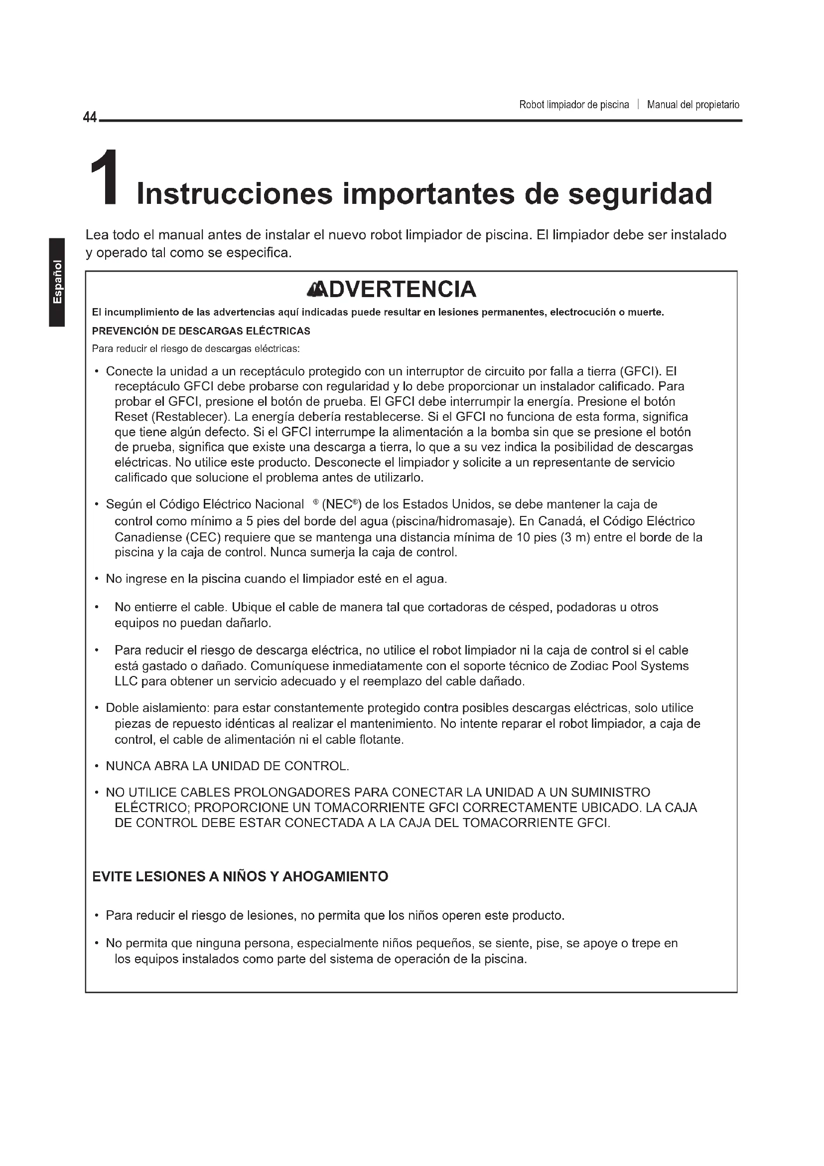 Robot limpiador de piscina Manual del propietario Robot limpiador de piscina Manual del propietario Español1 Instrucciones importantes de seguridad Lea todo el manual antes de instalar el nuevo robot limpiador de piscina. El limpiador debe ser instalado y operado tal como se especica. ADVERTENCIA El incumplimiento de las advertencias aquí indicadas puede resultar en lesiones permanentes, electrocución o muerte.PREVENCIÓN DE DESCARGAS ELÉCTRICASPara reducir el riesgo de descargas eléctricas:• Conecte la unidad a un receptáculo protegido con un interruptor de circuito por falla a tierra (GFCI). El receptáculo GFCI debe probarse con regularidad y lo debe proporcionar un instalador calicado. Para probar el GFCI, presione el botón de prueba. El GFCI debe interrumpir la energía. Presione el botón Reset (Restablecer). La energía debería restablecerse. Si el GFCI no funciona de esta forma, signica que tiene algún defecto. Si el GFCI interrumpe la alimentación a la bomba sin que se presione el botón de prueba, signica que existe una descarga a tierra, lo que a su vez indica la posibilidad de descargas eléctricas. No utilice este producto. Desconecte el limpiador y solicite a un representante de servicio calicado que solucione el problema antes de utilizarlo.• Según el Código Eléctrico Nacional (NEC ) de los Estados Unidos, se debe mantener la caja de control como mínimo a 5 pies del borde del agua (piscina/hidromasaje). En Canadá, el Código Eléctrico Canadiense (CEC) requiere que se mantenga una distancia mínima de 10 pies (3 m) entre el borde de la piscina y la caja de control. Nunca sumerja la caja de control.• No ingrese en la piscina cuando el limpiador esté en el agua.