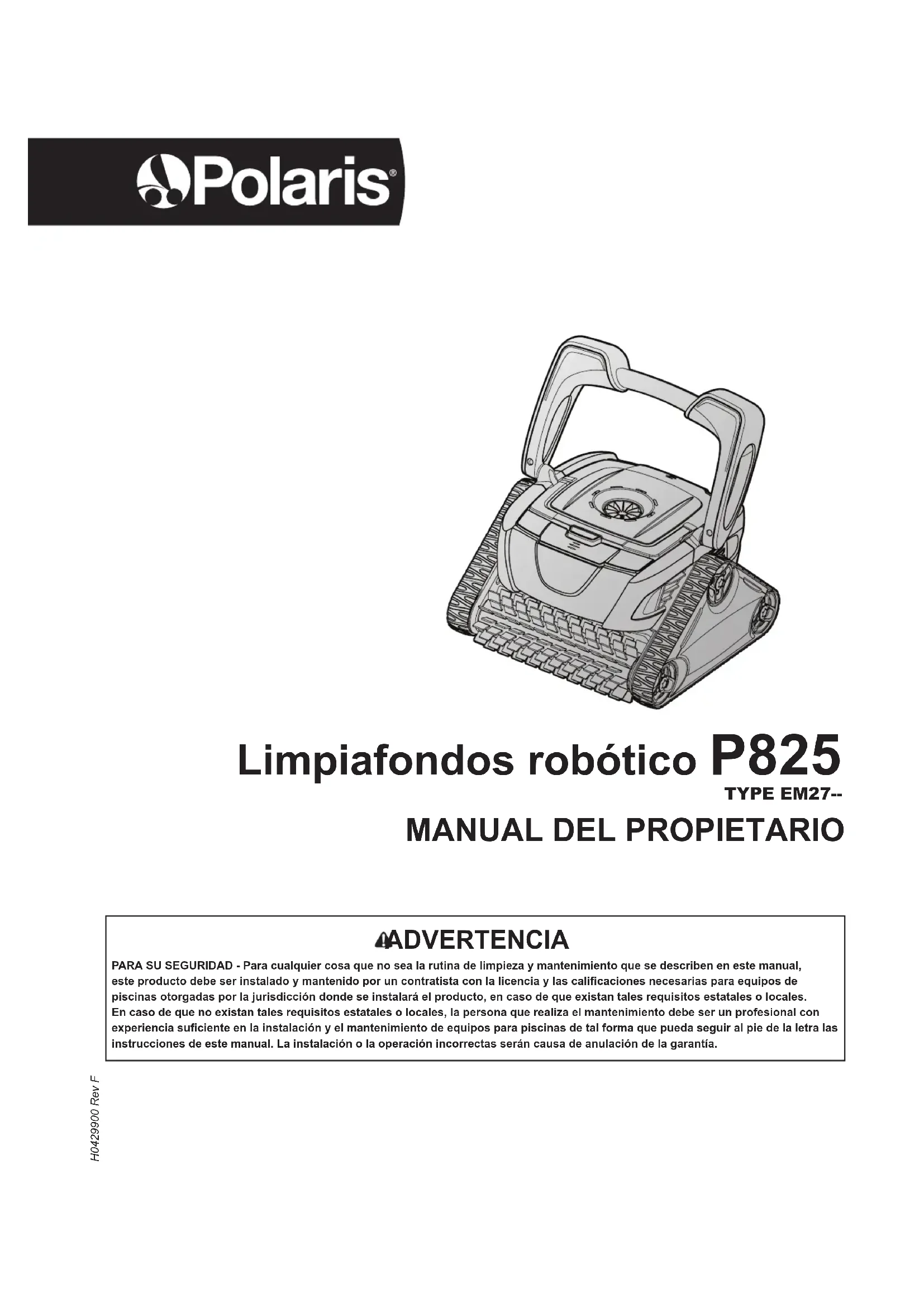 et le design de robot nettoyeur à 3 roues Polaris sont des marques déposées de Zodiac Pool Systems, Inc.ADVERTENCIA PARA SU SEGURIDAD - Para cualquier cosa que no sea la rutina de limpieza y mantenimiento que se describen en este manual, este producto debe ser instalado y mantenido por un contratista con la licencia y las calificaciones necesarias para equipos de piscinas otorgadas por la jurisdicción donde se instalará el producto, en caso de que existan tales requisitos estatales o locales. En caso de que no existan tales requisitos estatales o locales, la persona que realiza el mantenimiento debe ser un profesional con experiencia suficiente en la instalación y el mantenimiento de equipos para piscinas de tal forma que pueda seguir al pie de la letra las instrucciones de este manual. La instalación o la operación incorrectas serán causa de anulación de la garantía. H0429900 Rev F