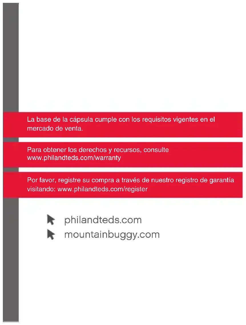 9dENTFERNEN DES SONNENDACHS UND BEZUGS 9a/9b Ziehen Sie auf der Seite des Sonnendachs an der Schlaufe und nehmen Sie das Gestell des Sonnendachs ab. 9c/9d Ziehen Sie den Bezug aus der Vorderseite der Schale.Españolmountainbuggy.com Por favor, registre su compra a través de nuestro registro de garantía visitando: www.philandteds.com/register Para obtener los derechos y recursos, consulte www.philandteds.com/warranty La base de la cápsula cumple con los requisitos vigentes en el mercado de venta. philandteds.com¡Enhorabuena por la elección de su nueva base de cápsula del asiento para el coche! Cuidado del producto Advertencias de seguridad Características InstruccionesCuidado del producto IMPORTANTE