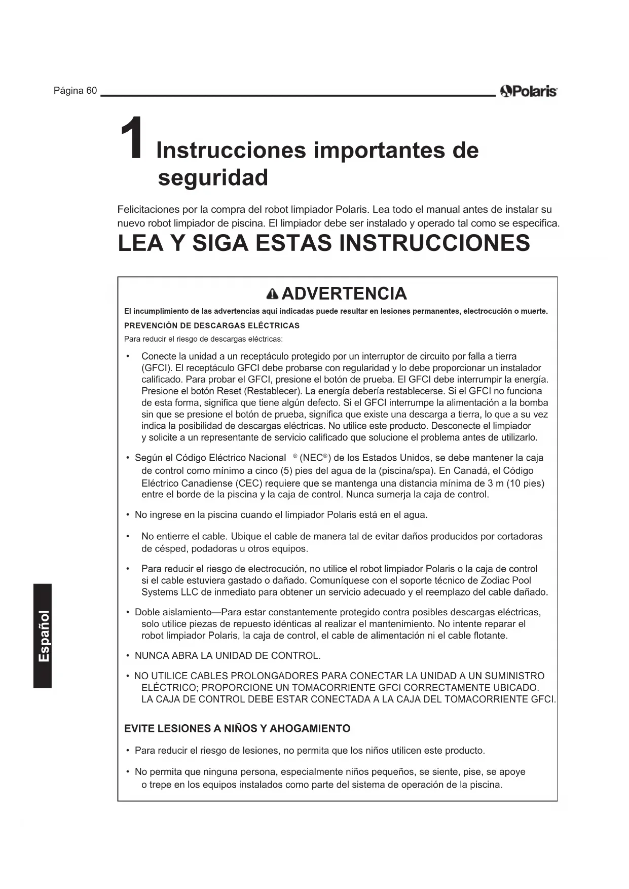 - Para reducir el riesgo de lesiones, no permita que los niños utilicen este producto.• No permita que ninguna persona, especialmente niños pequeños, se siente, pise, se apoye o trepe en los equipos instalados como parte del sistema de operación de la piscina. 1 Instrucciones importantes de seguridad Felicitaciones por la compra del robot limpiador Polaris. Lea todo el manual antes de instalar su nuevo robot limpiador de piscina. El limpiador debe ser instalado y operado tal como se especica. LEA Y SIGA ESTAS INSTRUCCIONESPágina 61 Español PRECAUCIÓN El incumplimiento de estas advertencias puede ocasionar daños a los equipos de la piscina o lesiones personales.• El limpiador Polaris debe ser instalado y operado tal como se especica.• Este producto está diseñado para el uso en piscinas instaladas de forma permanente. No utilice esta bomba en piscinas almacenables. Las piscinas permanentes están construidas dentro del suelo o sobre él o en un edicio de tal manera que no se pueden desmontar para su almacenamiento. Las piscinas portátiles están construidas de manera que pueden ser fácilmente desmontadas para su almacenamiento y pueden volver a montarse en su estado original.• Limpie el cartucho del ltro del limpiador Polaris después de cada uso.