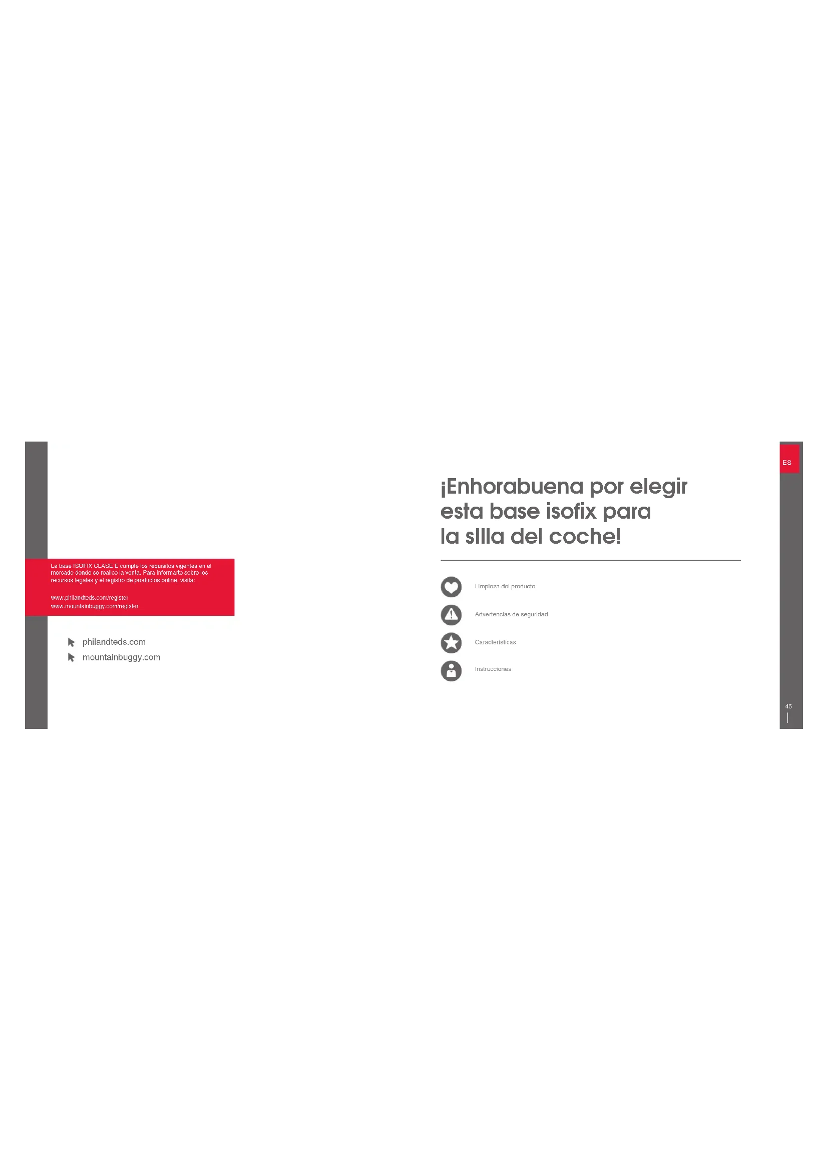 43¡Enhorabuena por elegir esta base isox para la sIlla del coche! Limpieza del producto Advertencias de seguridad Características Instrucciones La base ISOFIX CLASE E cumple los requisitos vigentes en el mercado donde se realice la venta. Para informarte sobre los recursos legales y el registro de productos online, visita: www.philandteds.com/register www.mountainbuggy.com/register mountainbuggy.com philandteds.com
