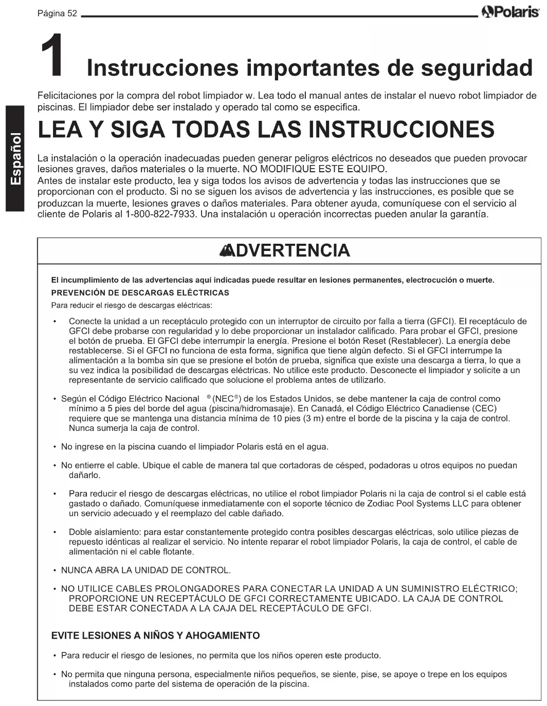 - Estos pasos le permitirán asegurarse el servicio de garantía del sistema, si fuera necesario. Si fuera necesario el servicio, póngase en contacto con su distribuidor original. Si el vendedor no realizara el servicio de garantía, visite la página www.polarispool.com para ubicar una empresa de servicios independiente cercana a usted. Si no puede ubicar una empresa de servicio, llame a nuestro departamento de soporte técnico al 1-800-822-7933. REGISTRE LOS DATOS DE SU LIMPIADOR POLARIS AQUÍ: Fecha de compra Comprado a Número de serie: (Situado en la cabeza del robot) Ciudad Estado/provincia Código postalContenido 1Instrucciones importantes de seguridad p. 52