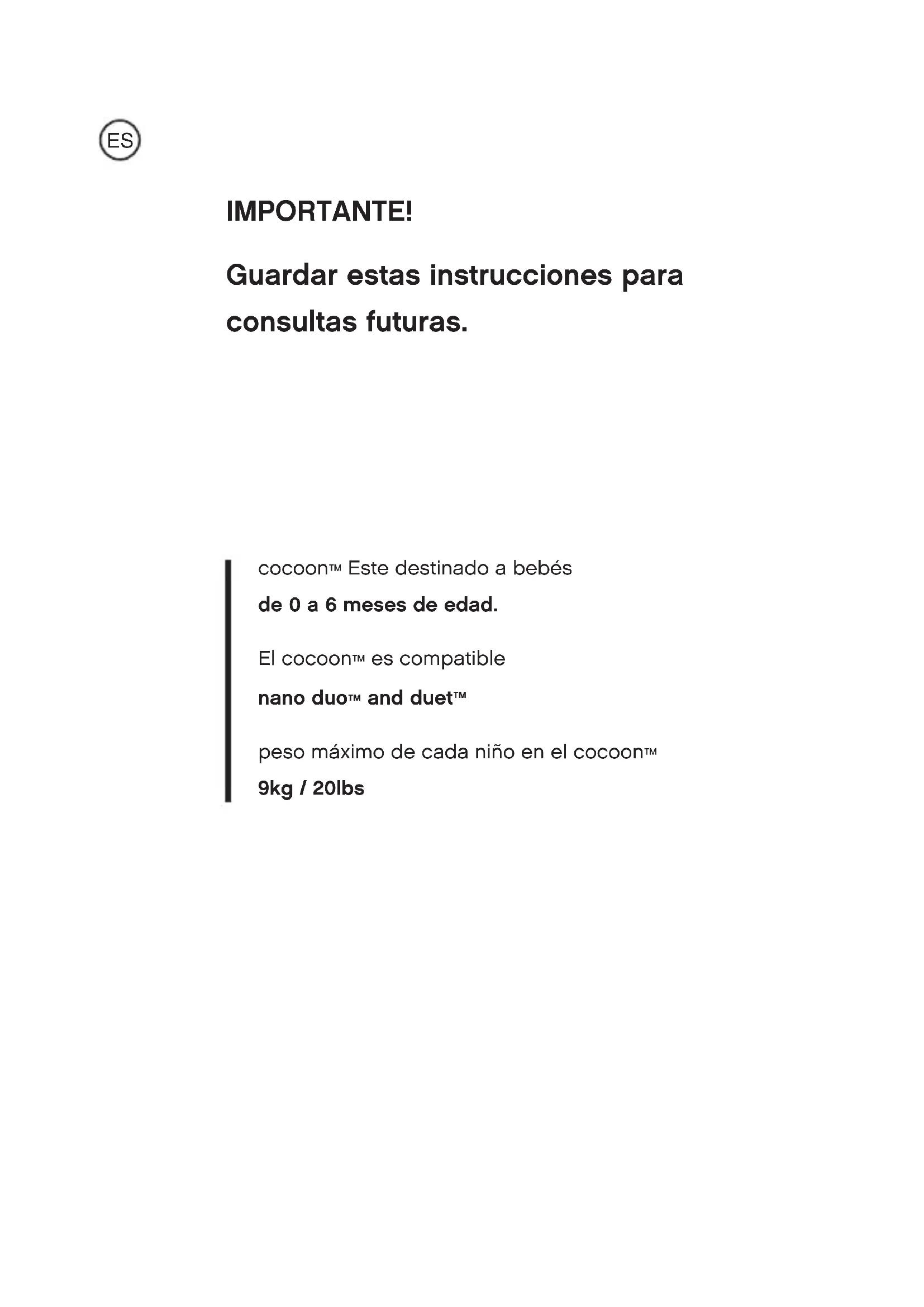 - Un cuidado inadecuado anulará todas las garantías. No utilices el cocoon™ si detectas o sospechas que hay deterioro. Cuidado y MantenimientoES *puede tener derecho a términos distintos en algunos países. garantía Todos nuestros productos cuentan con garantía de un año desde la fecha de compra ante defectos en sus materiales y en su producción.* Además, si registra su producto online dentro de los 30 días posteriores a la fecha de compra, obtendrá una garantía de dos años sin coste. Una vez registrado, puede extender la garantía mencionada anteriormente mediante la compra de la extensión de garantía, dentro de los 30 días posteriores a la compra. Por favor registra tu compra del producto a través de nuestro registro de garantía en línea visitando mountainbuggy.com/register33 ESEl Estándar de Seguridad Europeo dicta: IMPORTANTE – Leer las intrucciones cuidadosamente antes del uso y mantenerlas para futuras consultas.