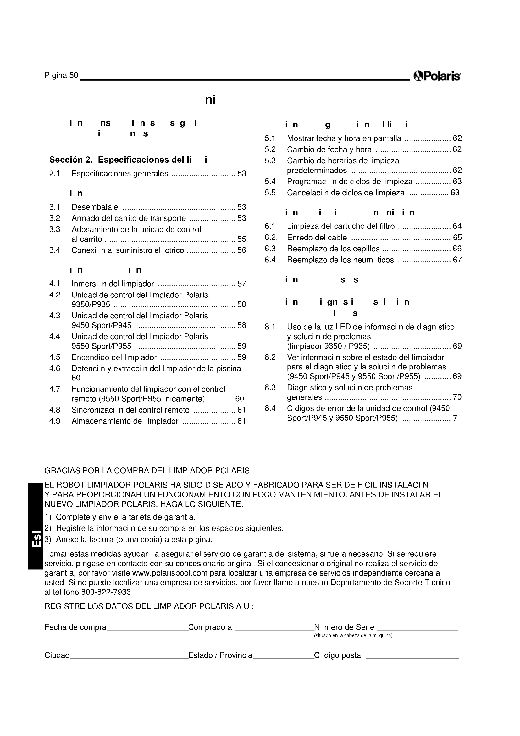 Tomar estas medidas ayudará a asegurar el servicio de garantí a del sistema, si fuera necesario. Si se requiere servicio, pó ngase en contacto con su concesionario original. Si el concesionario original no realiza el servicio de garantí a, por favor visite www.polarispool.com para localizar una empresa de servicios independiente cercana a usted. Si no puede localizar una empresa de servicios, por favor llame a nuestro Departamento de Soporte Té cnico al telé fono 800-822-7933. REGISTRE LOS DATOS DEL LIMPIADOR POLARIS AQ UÍ : Fecha de compra Comprado a Nú mero de Serie (situado en la cabeza de la má quina) Ciudad Estado / Provincia Có digo postal Í nd ic e S e c c ió n 1 . I nst r u c c io ne s d e se gu r id a d im p o r t a nt e s . . . . . . . . . . . . . . . . . . . . . . . . . . . . . . . . . . 5 2 Seccin 2. specicaciones del lim p ia d o r . . 5 3 .1 Especicaciones generales ............................. 53 S e c c ió n 3 . A r m a d o 5 3