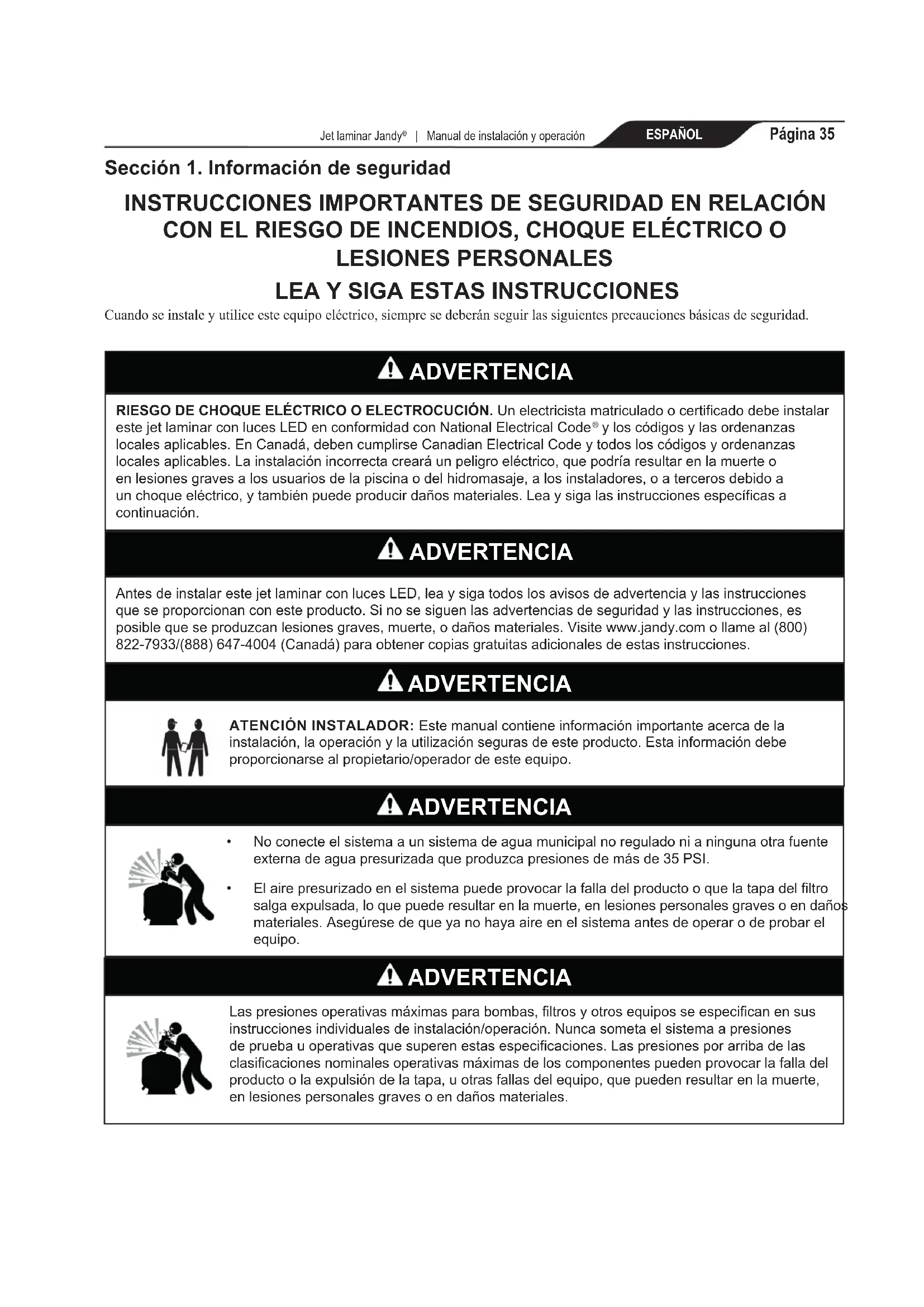 yloscódigosylasordenanzas localesaplicables.EnCanadá,debencumplirseCanadianElectricalCodeytodosloscódigosyordenanzas localesaplicables.Lainstalaciónincorrectacrearáunpeligroeléctrico,quepodríaresultarenlamuerteo enlesionesgravesalosusuariosdelapiscinaodelhidromasaje,alosinstaladores,oatercerosdebidoa unchoqueeléctrico,ytambiénpuedeproducirdañosmateriales.Leaysigalasinstruccionesespecíficasa continuación. ADVERTENCIA AntesdeinstalarestejetlaminarconlucesLED,leaysigatodoslosavisosdeadvertenciaylasinstrucciones queseproporcionanconesteproducto.Sinosesiguenlasadvertenciasdeseguridadylasinstrucciones,es posiblequeseproduzcanlesionesgraves,muerte,odañosmateriales.Visitewww.jandy.comollameal(800) 822-7933/(888)647-4004(Canadá)paraobtenercopiasgratuitasadicionalesdeestasinstrucciones. ADVERTENCIA ADVERTENCIA ATENCIÓN INSTALADOR: Estemanualcontieneinformaciónimportanteacercadela instalación,laoperaciónylautilizaciónsegurasdeesteproducto.Estainformacióndebe proporcionarsealpropietario/operadordeesteequipo.