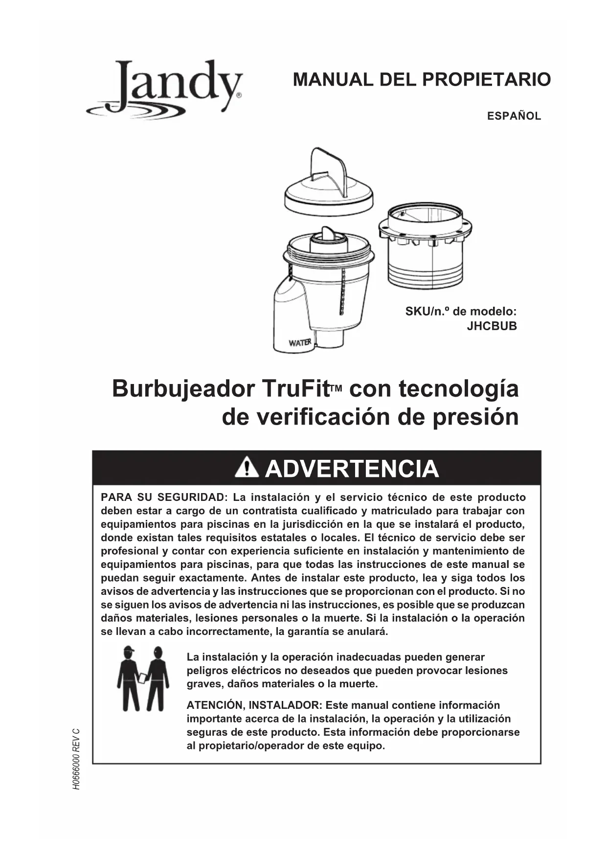 PARA SU SEGURIDAD: La instalación y el servicio técnico de este producto deben estar a cargo de un contratista cualificado y matriculado para trabajar con equipamientos para piscinas en la jurisdicción en la que se instalará el producto, donde existan tales requisitos estatales o locales. El técnico de servicio debe ser profesional y contar con experiencia suficiente en instalación y mantenimiento de equipamientos para piscinas, para que todas las instrucciones de este manual se puedan seguir exactamente. Antes de instalar este producto, lea y siga todos los avisos de advertencia y las instrucciones que se proporcionan con el producto. Si no se siguen los avisos de advertencia ni las instrucciones, es posible que se produzcan daños materiales, lesiones personales o la muerte. Si la instalación o la operación se llevan a cabo incorrectamente, la garantía se anulará. La instalación y la operación inadecuadas pueden generar peligros eléctricos no deseados que pueden provocar lesiones graves, daños materiales o la muerte. ATENCIÓN, INSTALADOR: Este manual contiene información importante acerca de la instalación, la operación y la utilización seguras de este producto. Esta información debe proporcionarse al propietario/operador de este equipo. ADVERTENCIA Burbujeador TruFit