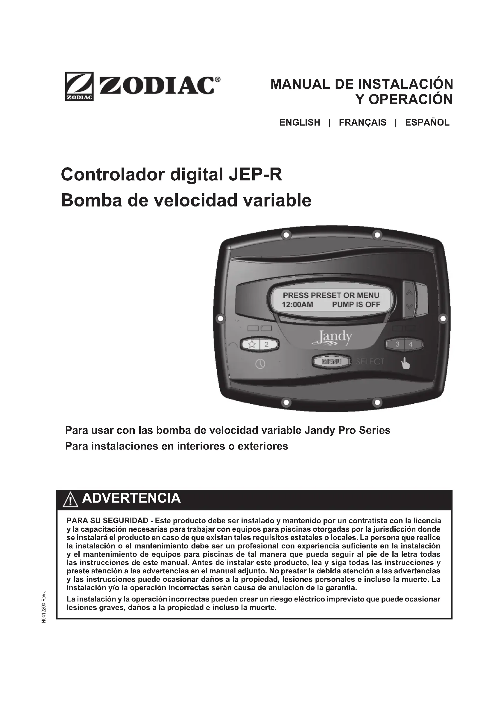 is a registered trademark of Zodiac International, S.A.S.U., used under license. All trademarks referenced herein are the property of their respective owners. H0412200 Rev J Zodiac Pool Systems Canada, Inc. 2115 South Service Road West, Unit 3 Oakville, ON L6L 5W2 1-888-647-4004 | www.ZodiacPoolSystems.caControlador digital JEP-R Bomba de velocidad variable ADVERTENCIA H0412200 Rev J PARA SU SEGURIDAD - Este producto debe ser instalado y mantenido por un contratista con la licencia y la capacitación necesarias para trabajar con equipos para piscinas otorgadas por la jurisdicción donde se instalará el producto en caso de que existan tales requisitos estatales o locales. La persona que realice la instalación o el mantenimiento debe ser un profesional con experiencia suficiente en la instalación y el mantenimiento de equipos para piscinas de tal manera que pueda seguir al pie de la letra todas las instrucciones de este manual. Antes de instalar este producto, lea y siga todas las instrucciones y preste atención a las advertencias en el manual adjunto. No prestar la debida atención a las advertencias y las instrucciones puede ocasionar daños a la propiedad, lesiones personales e incluso la muerte. La instalación y/o la operación incorrectas serán causa de anulación de la garantía. La instalación y la operación incorrectas pueden crear un riesgo eléctrico imprevisto que puede ocasionar lesiones graves, daños a la propiedad e incluso la muerte.