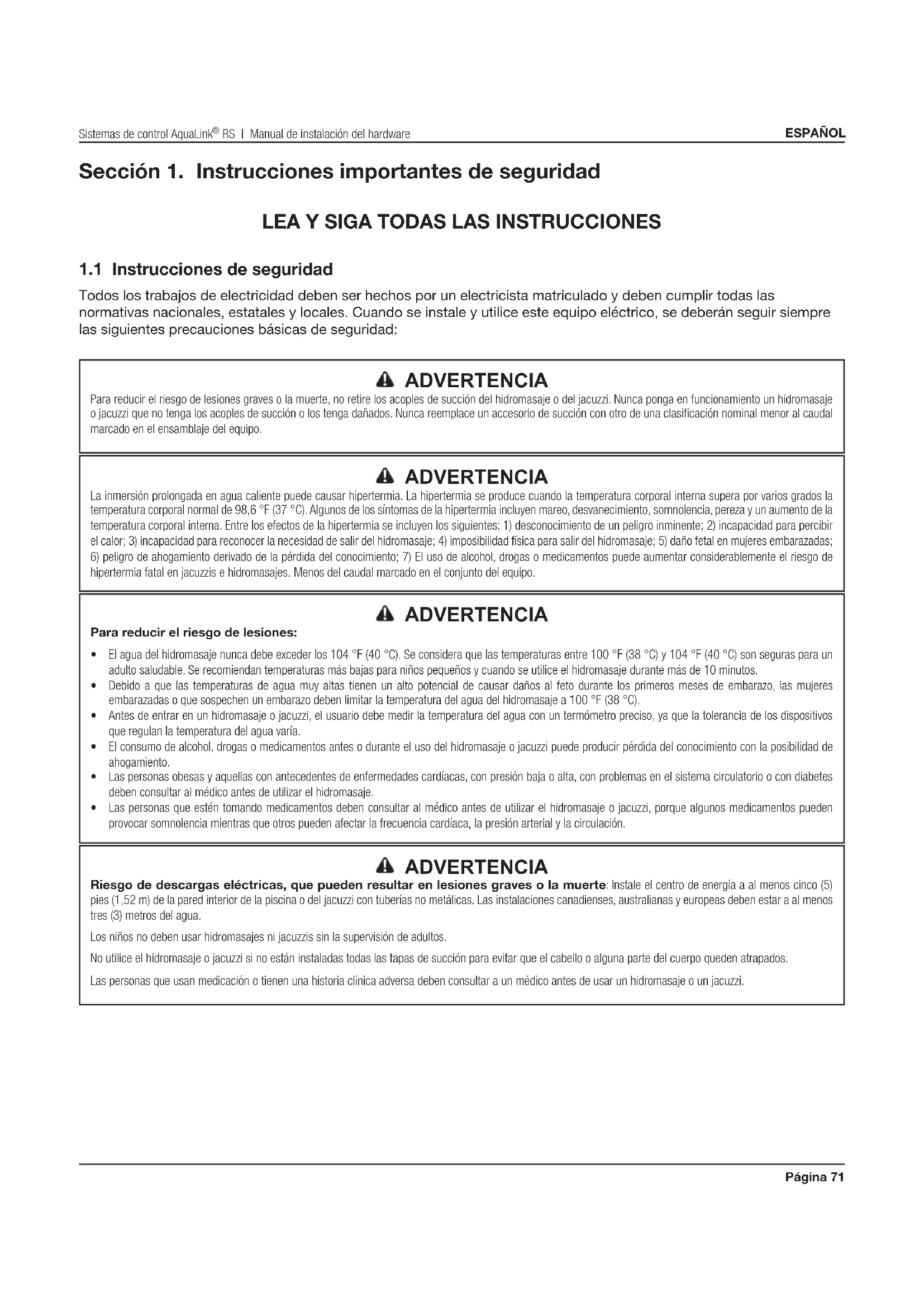 - Las personas que estén tomando medicamentos deben consultar al médico antes de utilizar el hidromasaje o jacuzzi, porque algunos medicamentos pueden provocar somnolencia mientras que otros pueden afectar la frecuencia cardíaca, la presión arterial y la circulación. ADVERTENCIA Riesgo de descargas eléctricas, que pueden resultar en lesiones graves o la muerte: Instale el centro de energía a al menos cinco (5) pies (1,52 m) de la pared interior de la piscina o del jacuzzi con tuberías no metálicas. Las instalaciones canadienses, australianas y europeas deben estar a al menos tres (3) metros del agua. Los niños no deben usar hidromasajes ni jacuzzis sin la supervisión de adultos. No utilice el hidromasaje o jacuzzi si no están instaladas todas las tapas de succión para evitar que el cabello o alguna parte del cuerpo queden atrapados. Las personas que usan medicación o tienen una historia clínica adversa deben consultar a un médico antes de usar un hidromasaje o un jacuzzi.Página 72 ESPAÑOL Sistemas de control AquaLink