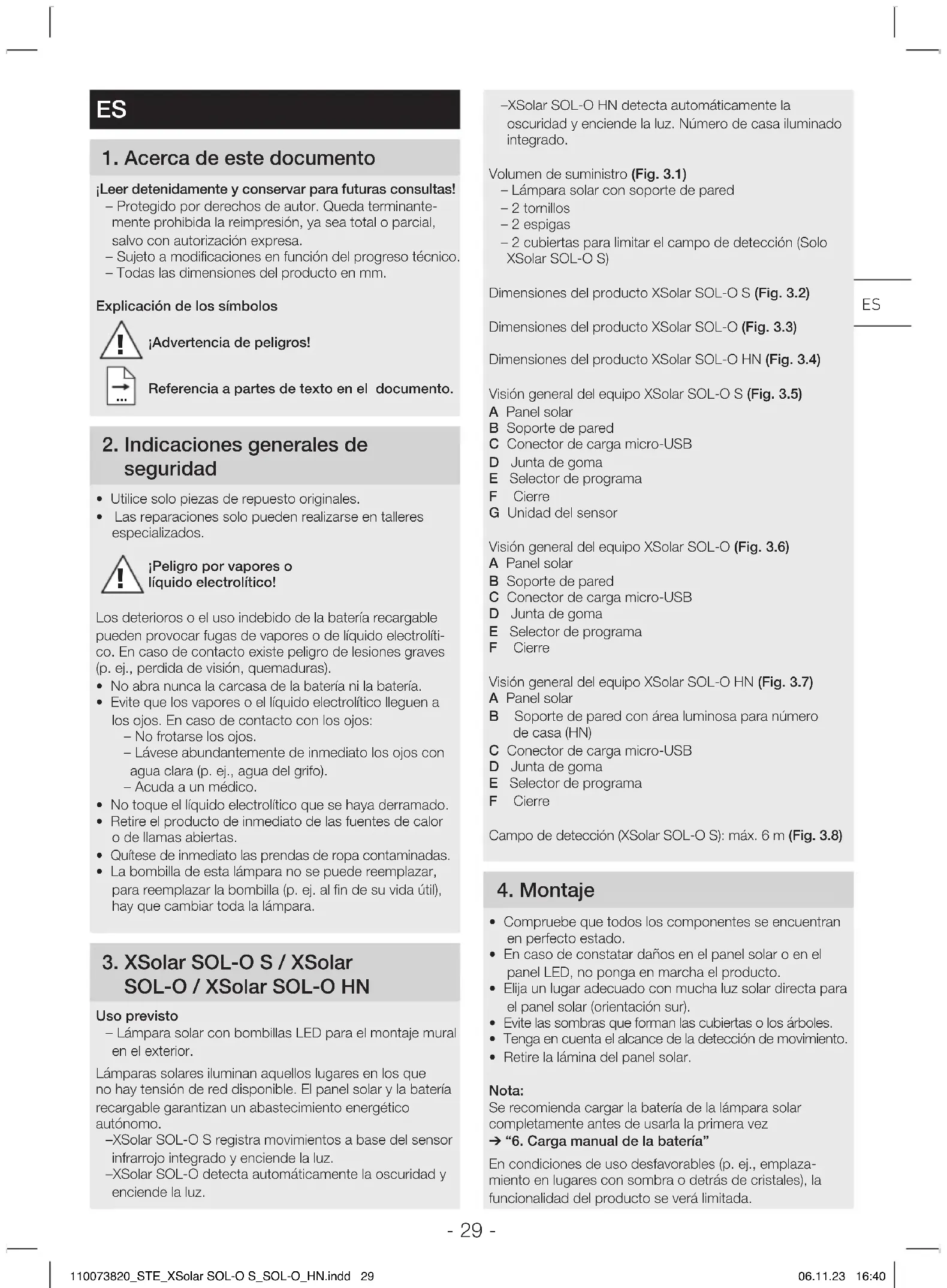 110073820_STE_XSolar SOL-O S_SOL-O_HN.indd 31110073820_STE_XSolar SOL-O S_SOL-O_HN.indd 31 06.11.23 16:4006.11.23 16:40- 32 - Datos técnicos batería XSolarSOL-OS XSolarSOL-O XSolarSOL-OHN Tipo litio-ferrofosfato (LiFePO4) Capacidad 2×2.000mAH 2.000mAH 2.000mAH Vida útil máx. 20días con 20 conmutaciones por noche Conector de carga micro-USB 5V,máx.1A 10 Datos técnicos Datos técnicos lámpara solar XSolarSOL-OS XSolarSOL-O XSolarSOL-OHN Dimensiones anch.xalt.xprof. (enmm) 242×53×91 242×38×91 242×183×91 Potencia máx.3,3W máx.0,1W máx.0,1W Ángulo de detección 360° - - Alcance de detección máx.6m - - Regulación crepuscular 2lux Temporización 10 – 30sautomáticamente - - Luz de cortesía 3 % - - Flujo luminoso máx. 273lm máx.7,5lm máx.7,5lm Eficiencia 83lm/W 75lm/W 75lm/W Temperatura cromática 3.000K Duración de los LEDs 50.000h Índice de protección IP44 Clase de aislamiento III Rango de temperatura -20°Chasta+40°C 110073820_STE_XSolar SOL-O S_SOL-O_HN.indd 32110073820_STE_XSolar SOL-O S_SOL-O_HN.indd 32 06.11.23 16:4006.11.23 16:40- 33 - Fallo Causa Remedio LED rojo en el sensor de movimiento/en la lámpara parpadea ■ La capacidad de la batería es demasiado baja ■ Cargue la batería con el adaptador de carga micro-USB La lámpara no se enciende ■ La capacidad de la batería es demasiado baja ■ Campo de detección no está bien ajustado ■ Cargue la batería con el adaptador de carga micro-USB ■ Compruebe el campo de detección La lámpara no se apaga ■ Constante movimiento en el campo de detección ■ Compruebe el campo de detección La lámpara se enciende inoportunamente ■ Movimiento descontrolado en el campo de detección. El viento mueve árboles y matorrales en el campo de detección. Detección de vehículos en la calle. Cambio de temperatura repentino debido a las condiciones atmosféricas (viento, lluvia, nieve) o a ventiladores o ventanas abiertas ■ La lámpara oscila (se mueve), p. ej., por las ráfagas de viento o fuertes precipitaciones ■ Compruebe el campo de detección ■ Monte la lámpara sobre una base firme La batería no se carga ■ El panel solar está sucio ■ El lugar donde se ha instalado el panel solar no es óptimo ■ Limpie el panel solar con un paño y un limpiador suaves ■ Controle el lugar de instalación (cuanto más luz solar directa, mejor) Peligro de daños materiales en caso de inutilización ■ En caso de no usar la lámpara durante un tiempo prolongado (p. ej., almacenamiento) la batería puede deteriorarse irreparablemente por descarga excesiva ■ Ponga el selector de programa en P0, resp., en OFF ■ Cargue la batería por completo antes de dejar de usarla ■ Cargue la batería regularmente durante el período de inutilización 11 Fallos de funcionamiento