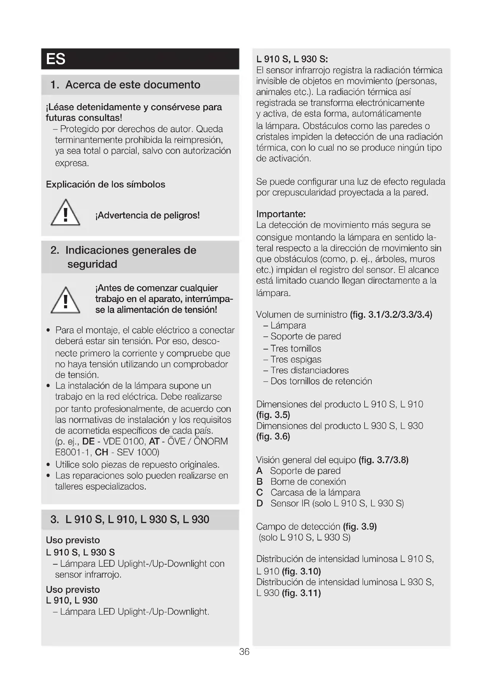 - Las reparaciones solo pueden realizarse en talleres especializados. 3 L910S, L910, L930S, L930 Uso previsto L910S, L930S – Lámpara LED Uplight-/Up-Downlight con sensor infrarrojo. Uso previsto L910, L930 – Lámpara LED Uplight-/Up-Downlight. L910S, L930S: El sensor infrarrojo registra la radiación térmica invisible de objetos en movimiento (personas, animales etc.). La radiación térmica así registrada se transforma electrónicamente y activa, de esta forma, automáticamente la lámpara. Obstáculos como las paredes o cristales impiden la detección de una radiación térmica, con lo cual no se produce ningún tipo de activación. Se puede configurar una luz de efecto regulada por crepuscularidad proyectada a la pared. Importante: La detección de movimiento más segura se consigue montando la lámpara en sentido la- teral respecto a la dirección de movimiento sin que obstáculos (como, p. ej., árboles, muros etc.) impidan el registro del sensor. El alcance está limitado cuando llegan directamente a la lámpara. Volumen de suministro (fig 31/32/33/34) – Lámpara – Soporte de pared – Tres tornillos – Tres espigas – Tres distanciadores – Dos tornillos de retención Dimensiones del producto L910S, L910 (fig 35) Dimensiones del producto L930S, L930 (fig 36) Visión general del equipo (fig 37/38) A Soporte de pared B Borne de conexión C Carcasa de la lámpara D Sensor IR (solo L910S, L930S) Campo de detección (fig 39) (solo L910S, L930S) Distribución de intensidad luminosa L910S, L910 (fig 310) Distribución de intensidad luminosa L930S, L930 (fig 311)37 4 Conexión eléctrica Diagrama electrónico (fig 41) El cable de alimentación de red consta de un conductor trifilar: L = fase (generalmente negro, marrón o gris) N = neutro (generalmente azul) PE = toma de tierra (verde/amarillo) K = hilo de comunicación (opcional) (solo L910S, L930S) En caso de dudas, hay que identificar los con- ductores con un comprobador de tensión; a continuación, volver a desconectar la tensión. La fase (L) y el neutro (N) se conectan al borne de conexión, la toma de tierra (PE) se conecta al borne (E). (fig 55/56) Importante: La inversión de las conexiones podrá provocar más tarde un cortocircuito en el aparato o en su caja de fusibles. En tal caso, habrá que identificar una vez más cada uno de los conductores y conectarlos de nuevo. Natural- mente, el cable de alimentación de red puede llevar montado un interruptor para conectar y desconectar la tensión. La bombilla de esta lámpara no se puede reemplazar, para reemplazar la bombilla (p. ej. al fin de su vida útil), hay que cambiar toda la lámpara. Comportamiento de grupo A través del hilo de comunicación (K) es posible una interconexión por grupos interna de STEINEL de L910S, L930S. Para ello rómpa- se la lengüeta cobertora en el compartimento de conexión. (fig42) Puede interconectarse un máx. de 10 lámparas. La longitud máx. del hilo de comunicación es de 50 m. La primera lámpara de un grupo que de- tecta un movimiento ENCIENDE todo el grupo. Una vez transcurrido un tiempo predefinido sin detectarse movimiento, la última lámpara de un grupo APAGA todo el grupo. Observación: – No se le deberá aplicar tensión de alimenta- ción al hilo de comunicación. ¡No conectar dispositivos externos! – Dentro de la interconexión por grupos, todas las lámparas obedecen a sus valores parti- culares ajustados vía conmutador DIP. – La modalidad de prueba no permite una interconexión por grupos. 5 Montaje