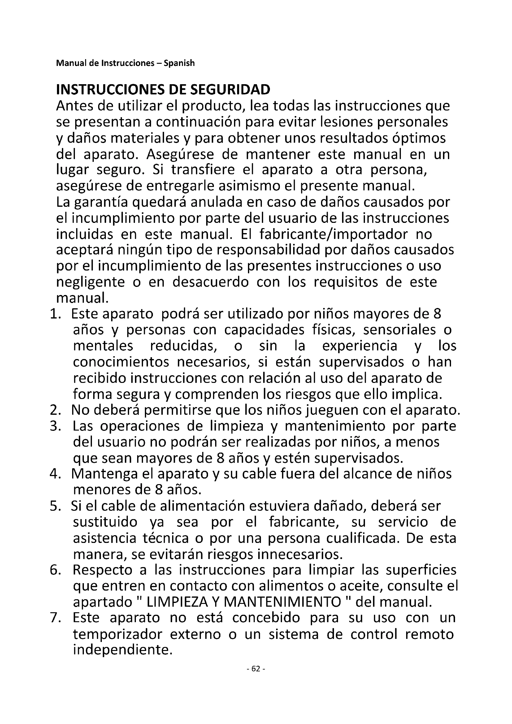 Antes de utilizar el producto, lea todas las instrucciones que se presentan a continuación para evitar lesiones personales y daños materiales y para obtener unos resultados óptimos del aparato. Asegúrese de mantener este manual en un lugar seguro. Si transfiere el aparato a otra persona, asegúrese de entregarle asimismo el presente manual. La garantía quedará anulada en caso de daños causados por el incumplimiento por parte del usuario de las instrucciones incluidas en este manual. El fabricante/importador no aceptará ningún tipo de responsabilidad por daños causados por el incumplimiento de las presentes instrucciones o uso negligente o en desacuerdo con los requisitos de este manual.