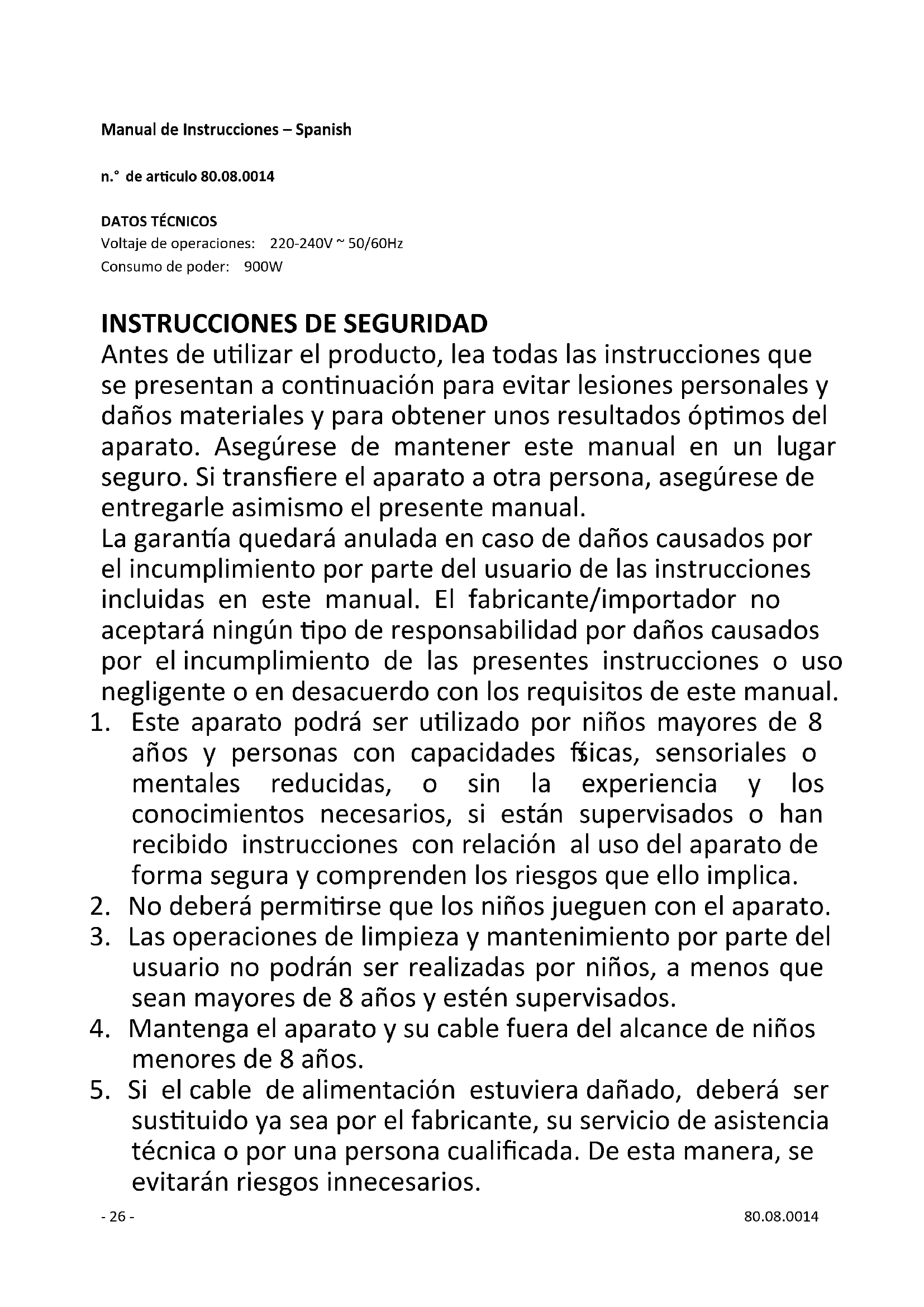 Antes de utilizar el producto, lea todas las instrucciones que se presentan a continuación para evitar lesiones personales y daños materiales y para obtener unos resultados óptimos del aparato. Asegúrese de mantener este manual en un lugar seguro. Si transfiere el aparato a otra persona, asegúrese de entregarle asimismo el presente manual. La garantía quedará anulada en caso de daños causados por el incumplimiento por parte del usuario de las instrucciones incluidas en este manual. El fabricante/importador no aceptará ningún tipo de responsabilidad por daños causados por el incumplimiento de las presentes instrucciones o uso negligente o en desacuerdo con los requisitos de este manual.
