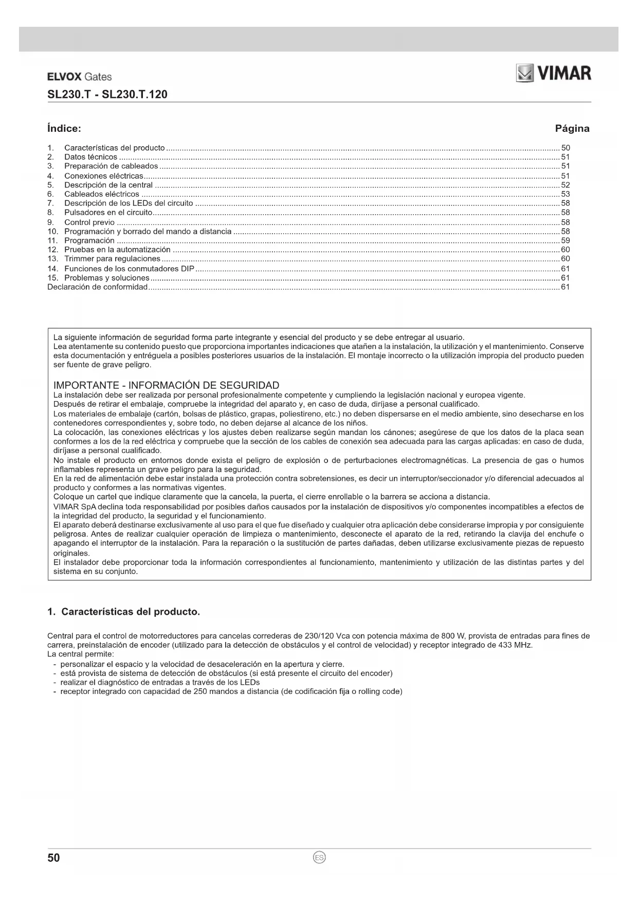SL230.T - SL230.T.1205. Descripción de la central. Central para el control de motorreductores para cancelas correderas de 230/120 Vca, provista de entrada para n de carrera con receptor integrado. La central permite: - personalizar el espacio y la velocidad de desaceleración en la apertura y cierre. - está provista de sistema de detección de obstáculos (si está presente el circuito del encoder) - realizar el diagnóstico de entradas a través de los LEDs - receptor integrado con capacidad de 250 mandos a distancia (de codicación ja o rolling code) F2=F5A
