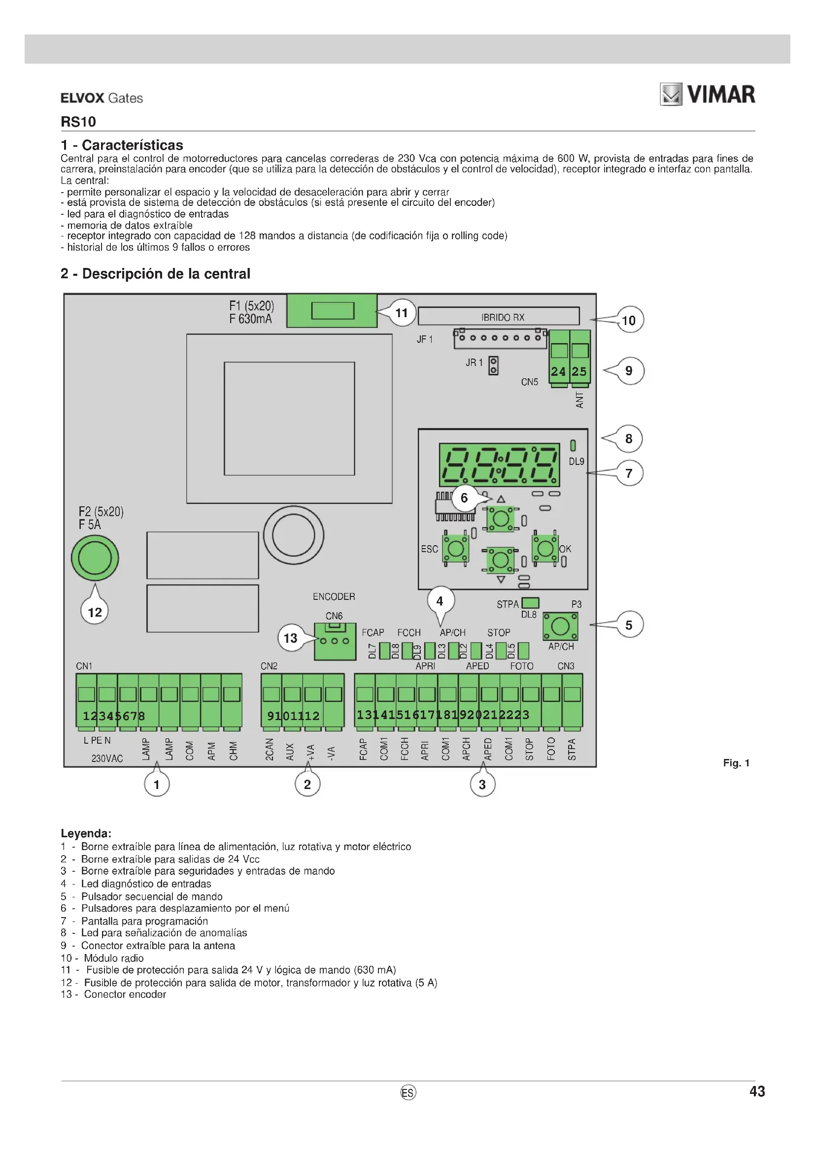 Leyenda: 1 - Borne extraíble para línea de alimentación, luz rotativa y motor eléctrico2 - Borne extraíble para salidas de 24 Vcc3 - Borne extraíble para seguridades y entradas de mando4 - Led diagnóstico de entradas5 - Pulsador secuencial de mando6 - Pulsadores para desplazamiento por el menú7 - Pantalla para programación8 - Led para señalización de anomalías9 - Conector extraíble para la antena10 - Módulo radio