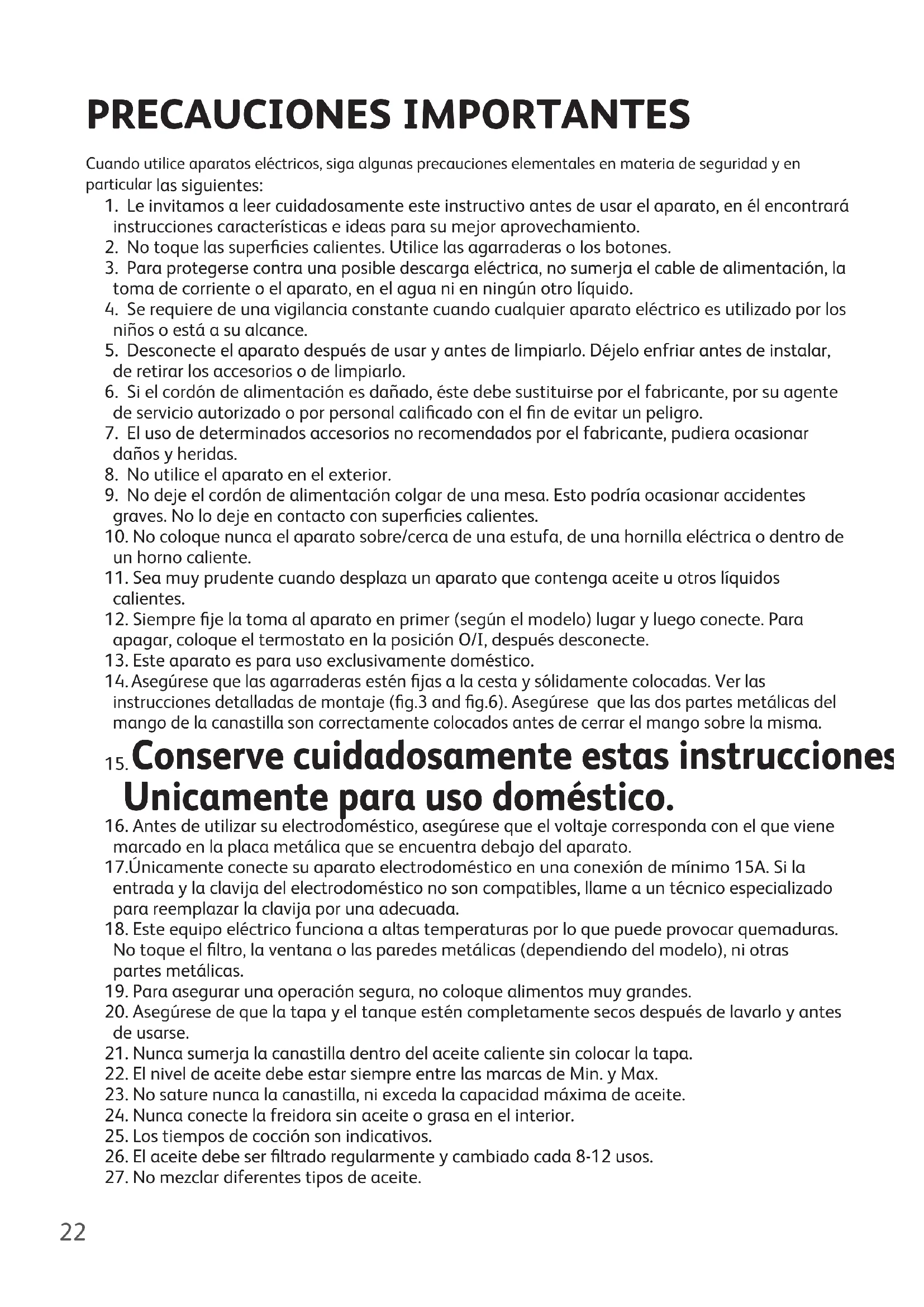 21. Nunca sumerja la canastilla dentro del aceite caliente sin colocar la tapa.