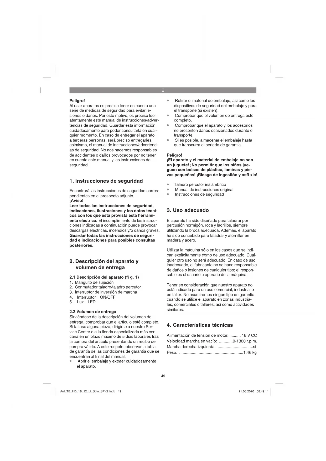 Peligro! Al usar aparatos es preciso tener en cuenta una serie de medidas de seguridad para evitar le- siones o daños. Por este motivo, es preciso leer atentamente este manual de instrucciones/adver- tencias de seguridad. Guardar esta información cuidadosamente para poder consultarla en cual- quier momento. En caso de entregar el aparato a terceras personas, será preciso entregarles, asimismo, el manual de instrucciones/advertenci- as de seguridad. No nos hacemos responsables de accidentes o daños provocados por no tener en cuenta este manual y las instrucciones de seguridad.