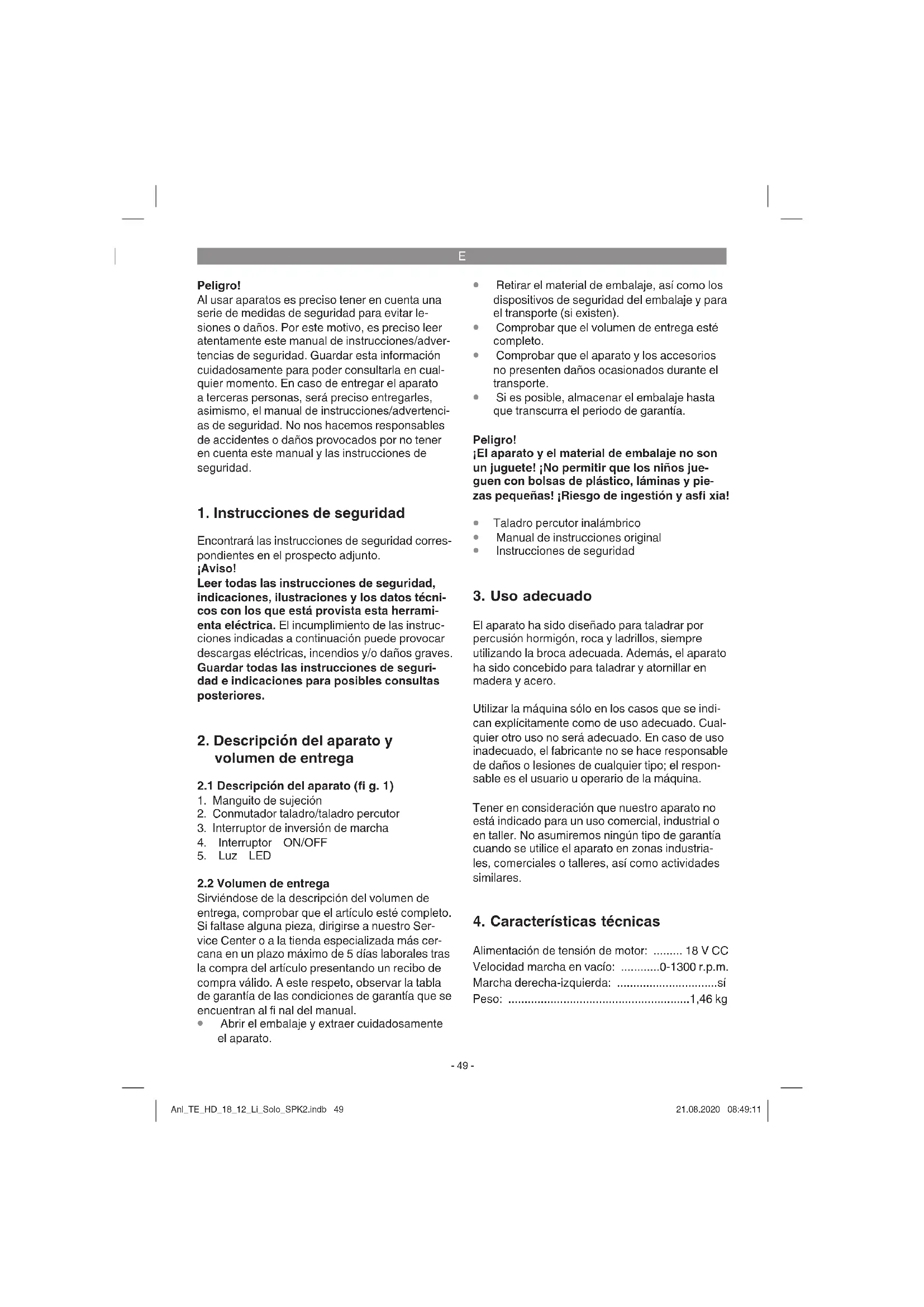 Sólo para países miembros de la UE No tirar herramientas eléctricas en la basura casera. Según la directiva europea 2012/19/CE sobre aparatos usados electrónicos y eléctricos y su aplicación en el derecho nacional, dichos aparatos deberán recojerse por separado y eliminarse de modo ecológi- co para facilitar su posterior reciclaje. Alternativa de reciclaje en caso de devolución: El propietario del aparato eléctrico, en caso de no optar por su devolución, está obligado a reciclar ade- cuadamente dicho aparato eléctrico. Para ello, también se puede entregar el aparato usado a un centro de reciclaje que trate la eliminación de residuos respetando la legislación nacional sobre residuos y su reciclaje. Esto no afecta a los medios auxiliares ni a los accesorios sin componentes eléctricos que acompañan a los aparatos usados. Sólo está permitido copiar la documentación y documentos anexos del producto, o extractos de los mismos, con autorización expresa de Einhell Germany AG. Nos reservamos el derecho a realizar modifi caciones técnicas Anl_TE_HD_18_12_Li_Solo_SPK2.indb 54Anl_TE_HD_18_12_Li_Solo_SPK2.indb 54 21.08.2020 08:49:1121.08.2020 08:49:11E