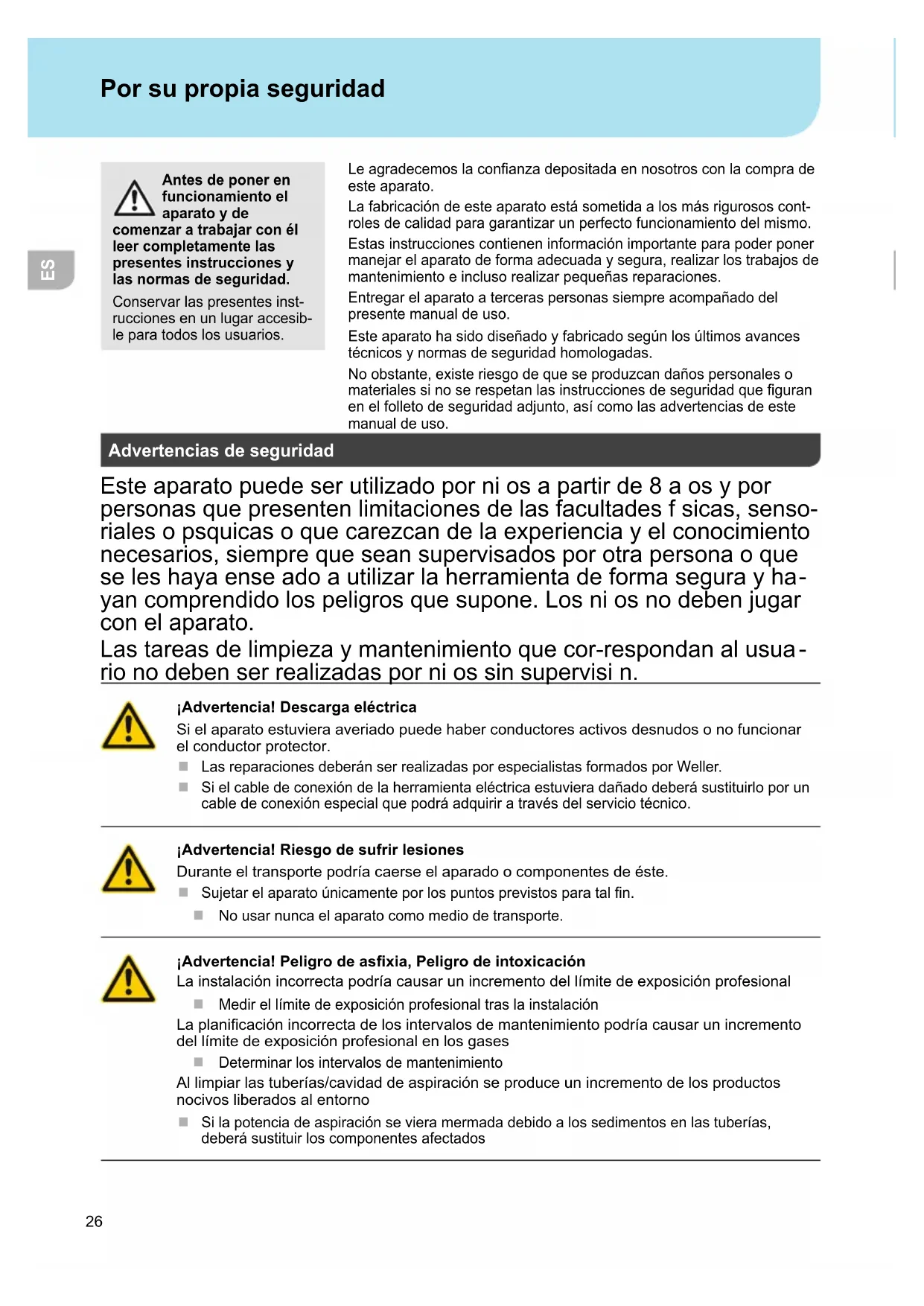 Filtro previo Nivel 1 iltrodepolvonoclase Filtro compacto Niveles 2; 3 iltrodepartículasiltrodegascarnactivohe- misor Puerto RS232 travésdelpuertosepuedemanejarycontrolarcompletamente el aparato. Interfaz travésdelpuertosepuedeejecutarlaactualizacindelrmare unaprueadeecienciaylafuncinogdedatos amemoriapuedeestarconectadacomomáimominutos espuéselmdulosedesconectaautomáticamente Datos Técnicos Garantía Los derechos de reclamación por defectos del comprador prescriben un año después de la compra. Sólo válidoparalosderechosdelcompradorsegnelartcdigocivilalemán nicamentenosresponsailizamosdelosderechosdegarantíacuandolagarantíadecomprayvidatildel aparatohayasidoentregadapornosotrosporescritoyutilizandoeltérminoarantía agarantíauedaráanuladaencasodemanipulacininadecuadadelaparatoocuandoseautilizadopor operariosnocualicados ¡Reservado el derecho a realizar modicaciones técnicas! Para más información visite nuestra web: www.weller-tools.com29