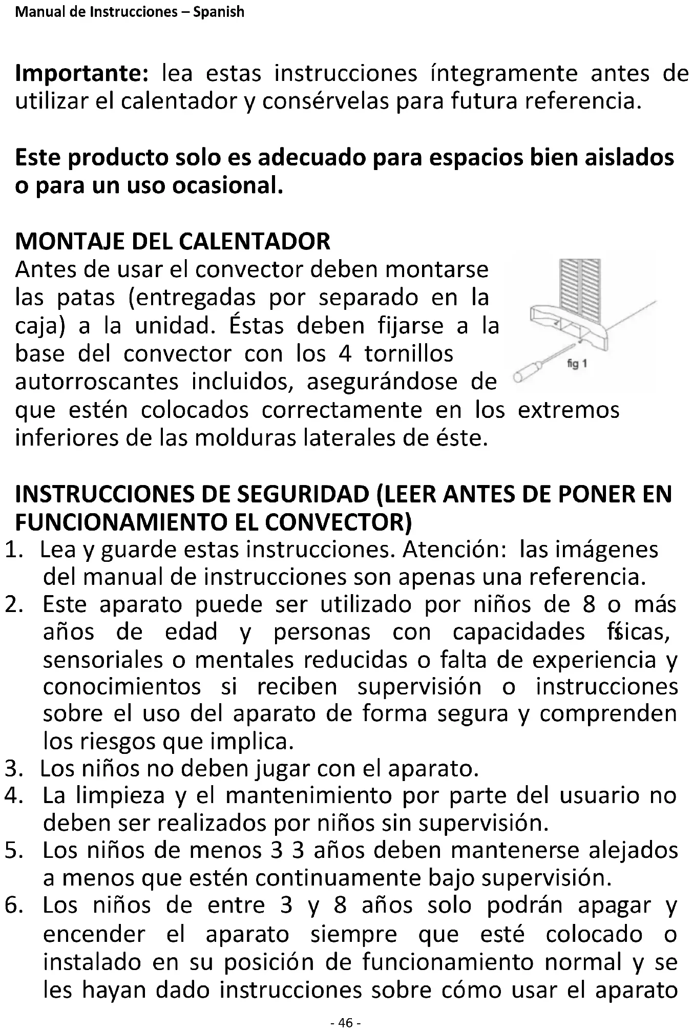 Antes de usar el convector deben montarse las patas (entregadas por separado en la caja) a la unidad. Éstas deben fijarse a la base del convector con los 4 tornillos autorroscantes incluidos, asegurándose de que estén colocados correctamente en los extremos inferiores de las molduras laterales de éste. INSTRUCCIONES DE SEGURIDAD (LEER ANTES DE PONER EN FUNCIONAMIENTO EL CONVECTOR)