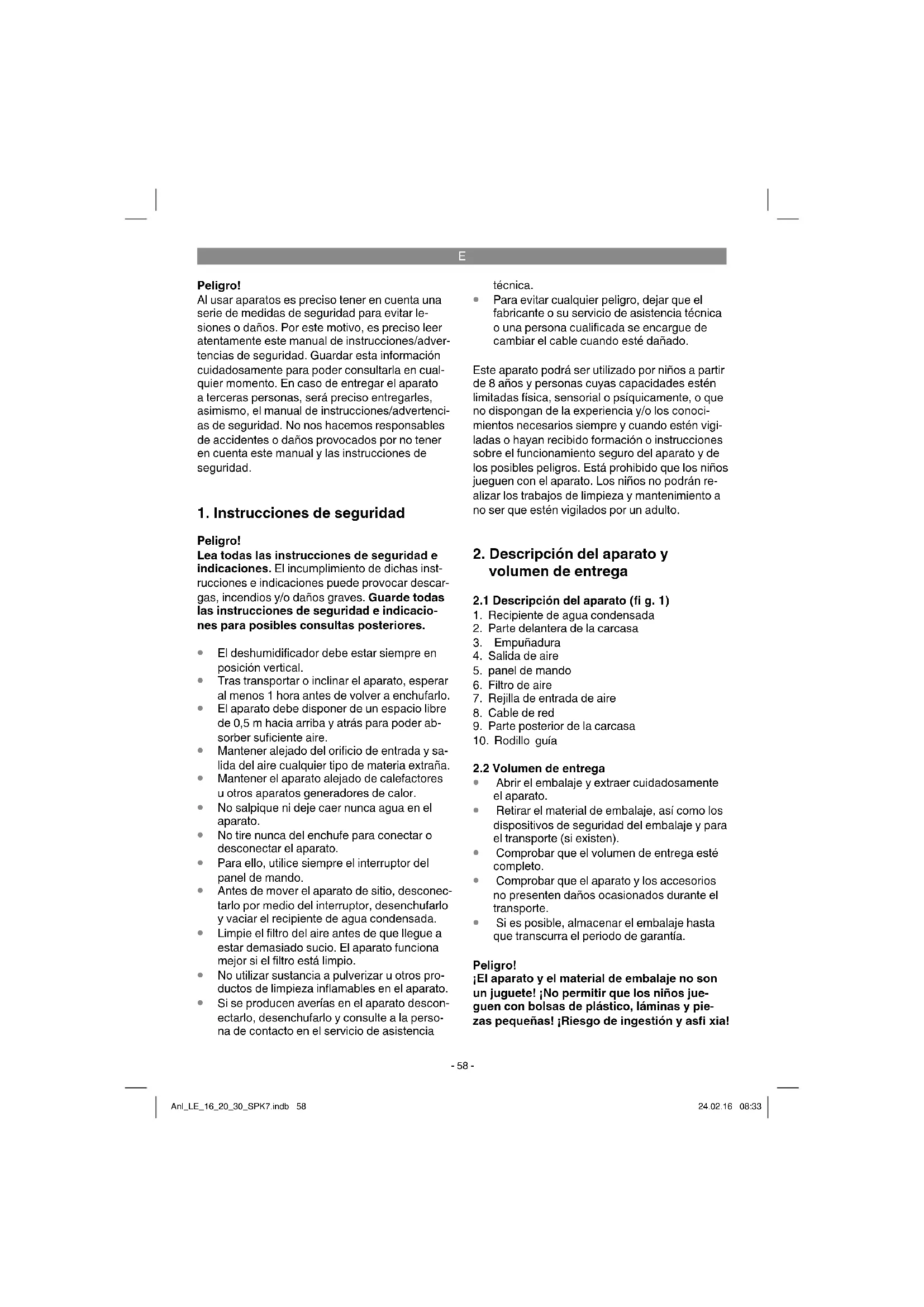 Si es posible, almacenar el embalaje hasta que transcurra el periodo de garantía. Peligro! ¡El aparato y el material de embalaje no son un juguete! ¡No permitir que los niños jue- guen con bolsas de plástico, láminas y pie- zas pequeñas! ¡Riesgo de ingestión y asfi xia! Anl_LE_16_20_30_SPK7.indb 58Anl_LE_16_20_30_SPK7.indb 58 24.02.16 08:3324.02.16 08:33E