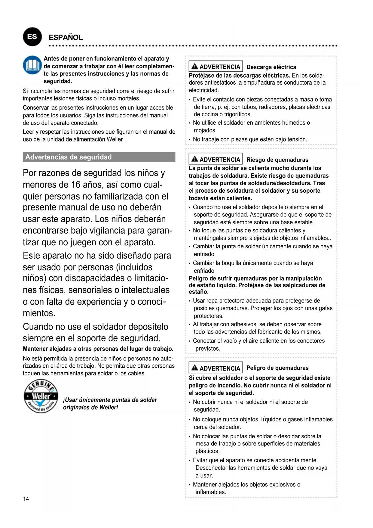 ENGLISH14 Antes de poner en funcionamiento el aparato y de comenzar a trabajar con él leer completamen- te las presentes instrucciones y las normas de seguridad. Si incumple las normas de seguridad corre el riesgo de sufrir importantes lesiones físicas o incluso mortales. Conservar las presentes instrucciones en un lugar accesible para todos los usuarios. Siga las instrucciones del manual de uso del aparato conectado. Leer y respetar las instrucciones que guran en el manual de uso de la unidad de alimentación Weller . Advertencias de seguridad Por razones de seguridad los niños y menores de 16 años, así como cual- quier personas no familiarizada con el presente manual de uso no deberán usar este aparato. Los niños deberán encontrarse bajo vigilancia para garan- tizar que no juegen con el aparato. Este aparato no ha sido diseñado para ser usado por personas (incluidos niños) con discapacidades o limitacio