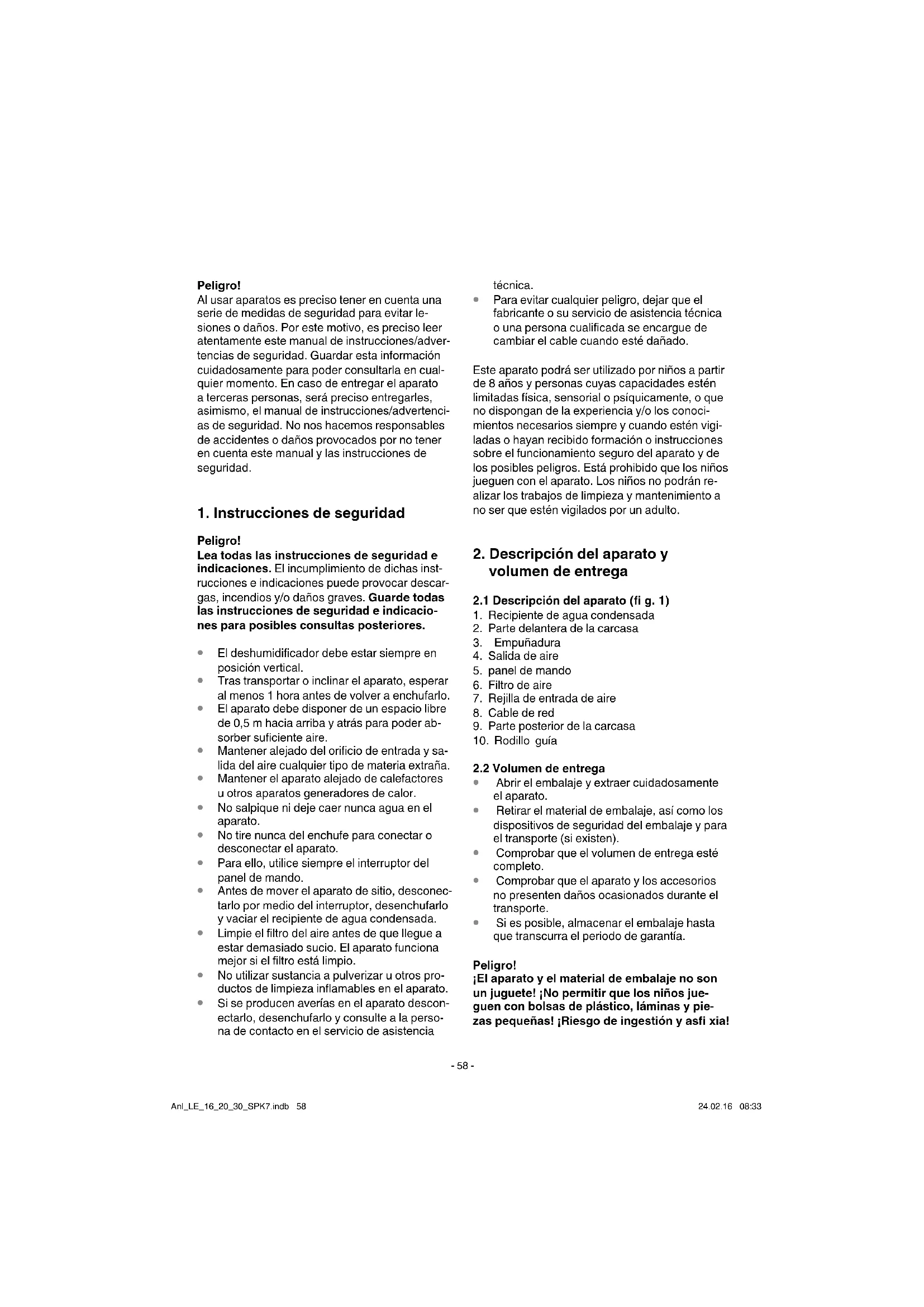 Si es posible, almacenar el embalaje hasta que transcurra el periodo de garantía. Peligro! ¡El aparato y el material de embalaje no son un juguete! ¡No permitir que los niños jue- guen con bolsas de plástico, láminas y pie- zas pequeñas! ¡Riesgo de ingestión y asfi xia! Anl_LE_16_20_30_SPK7.indb 58Anl_LE_16_20_30_SPK7.indb 58 24.02.16 08:3324.02.16 08:33E