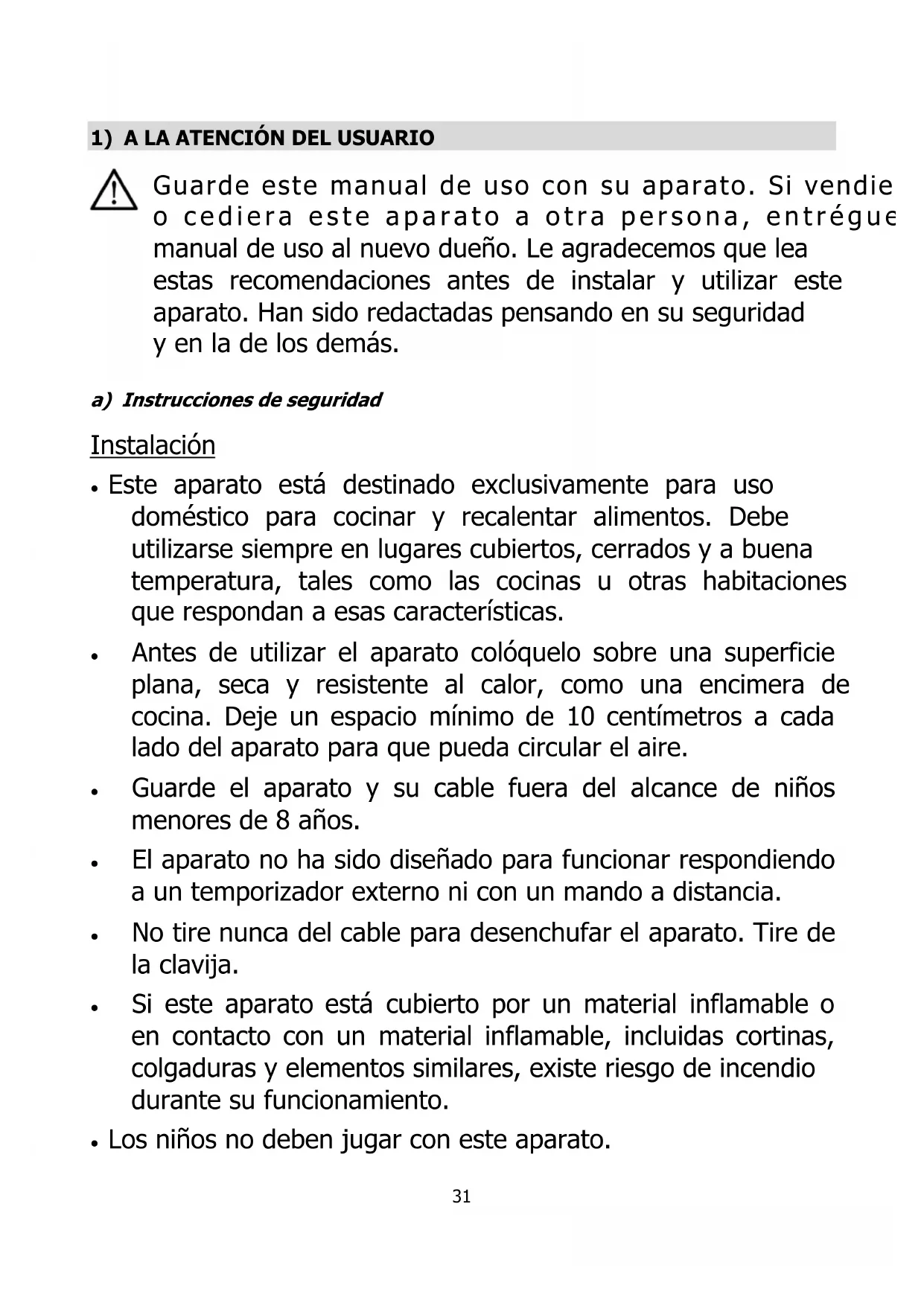 a) Instalación de su aparato con toda seguridad Si el horno se coloca demasiado cerca de una pared existe riesgo de que esta se queme o ensucie. Vigile que las cortinas, etc. no entren en contacto con el horno. No coloque ningún objeto entre la base del horno y la superficie sobre la que esté colocado. Cualquier objeto que se encuentre debajo del horno puede quemarse. No coloque ningún objeto sobre el horno cuando esté en marcha porque el calor podría deformarlo, fisurarlo o dañarlo. No caliente alimentos embotellados ni enlatados porque el recipiente podría romperse y quemarle. Utilice siempre la pinza cuando introduzca o retire la bandeja. Si la toca puede quemarse gravemente. No vierta nunca agua en el horno si está caliente. Cuando desenchufe el aparato, tire siempre de la clavija. No tire nunca del cable porque podría romper los cables interiores. Cuando el aparato esté en uso no lo coloque nunca cerca de un quemador de gas, una fuente de calor fuerte o un ventilador eléctrico, etc., ya que podría dañar el control de la temperatura. No moje el cable de alimentación ni manipule el aparato con las manos mojadas. Desenchufe siempre el cable tras el uso del aparato o cuando este esté sin vigilancia. Si lo deja enchufado, un mal funcionamiento puede provocar un incendio. Si cocina platos con aceite, como un pollo asado, se recomienda utilizar 2 hojas de aluminio para reducir las salpicaduras. Coloque una hoja sobre la bandeja y la otra sobre el pollo. De esa manera el aceite se mantendrá entre las dos hojas. Advertencia: Compruebe que su aparato no ha sufrido daños durante su transporte (puerta o juntas deformadas, etc.). Si descubre algún deterioro póngase en contacto con su distribuidor antes de seguir utilizando el aparato.36 b) Conexiones eléctricas El horno tiene que estar conectado a una toma eléctrica adaptada. Introduzca la clavija por completo en el enchufe. De lo contrario podría calentar en exceso. No utilice una toma de luz corriente. No conecte nunca varias clavijas en una misma toma. c) Descripción de su aparato El horno:
