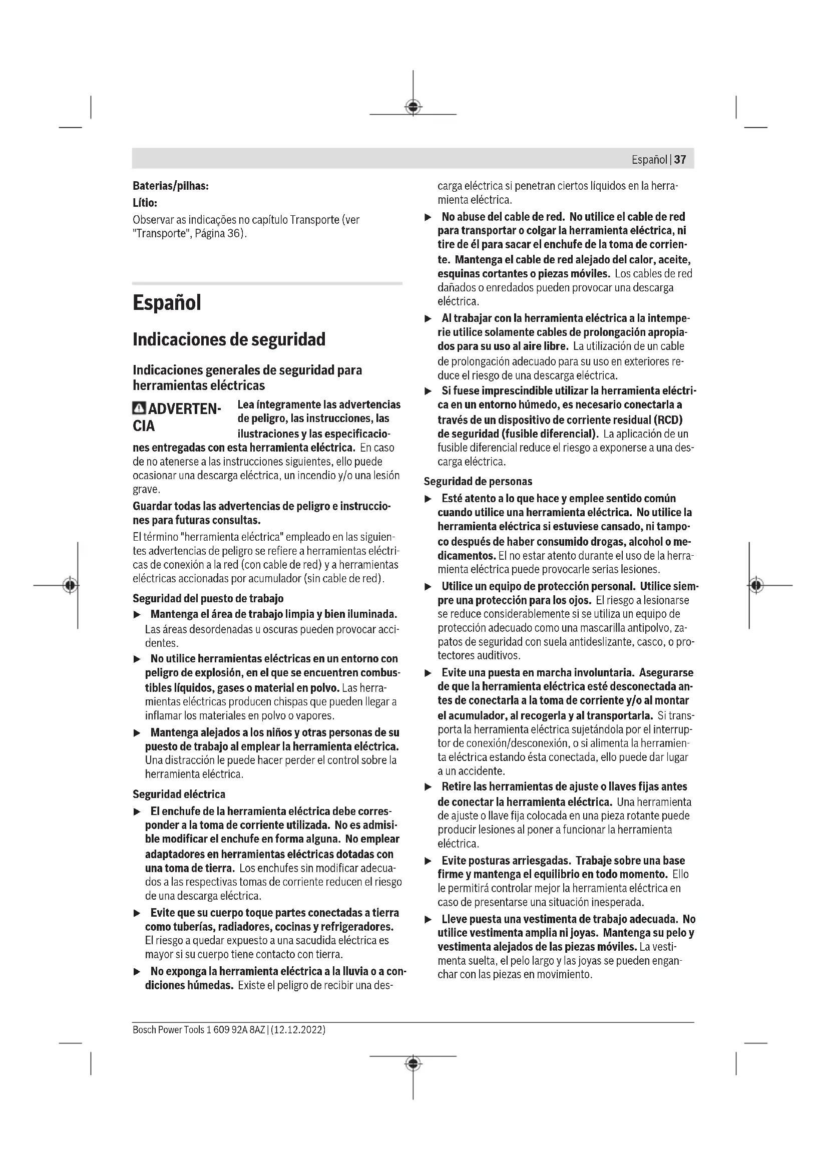 El nivel de vibraciones y el valor de emisiones de ruidos indi- cados en estas instrucciones han sido determinados según un procedimiento de medición normalizado y pueden servir como base de comparación con otras herramientas eléctri- cas. También son adecuados para estimar provisionalmente la emisión de vibraciones y ruidos. El nivel de vibraciones y el valor de emisiones de ruidos indi- cados han sido determinados para las aplicaciones principa- les de la herramienta eléctrica. Por ello, el nivel de vibracio- nes y el valor de emisiones de ruidos pueden ser diferentes si la herramienta eléctrica se utiliza para otras aplicaciones, con útiles diferentes, o si el mantenimiento de la misma fue- se deficiente. Ello puede suponer un aumento drástico de la emisión de vibraciones y de ruidos durante el tiempo total de trabajo. Para determinar con exactitud las emisiones de vibraciones y de ruidos, es necesario considerar también aquellos tiem- pos en los que el aparato esté desconectado, o bien, esté en funcionamiento, pero sin ser utilizado realmente. Ello puede suponer una disminución drástica de las emisiones de vibra- ciones y de ruidos durante el tiempo total de trabajo. Fije unas medidas de seguridad adicionales para proteger al usuario de los efectos por vibraciones, como por ejemplo: Mantenimiento de la herramienta eléctrica y de los útiles, conservar calientes las manos, organización de las secuen- cias de trabajo. Acumulador Bosch también vende herramientas eléctricas accionadas por acumulador sin acumulador. En el embalaje puede ver si un acumulador está incluido en el volumen de suministro de su herramienta eléctrica. Carga del acumulador u Utilice únicamente los cargadores que se enumeran en los datos técnicos. Solamente estos cargadores han sido especialmente adaptados a los acumuladores de io- nes de litio empleados en su herramienta eléctrica. Indicación: Los acumuladores de iones de litio se entregan parcialmente cargados debido a la normativa de transporte internacional. Con el fin de obtener la plena potencia del acumulador, cargue completamente el acumulador antes de su primer uso. Montaje del acumulador Desplace el acumulador cargado en el alojamiento del acu- mulador, hasta que encastre perceptible. Desmontaje del acumulador Para la extracción del acumulador, presione la tecla de de- senclavamiento y retire el acumulador. No proceda con brusquedad. El acumulador dispone de 2etapas de enclavamiento para evitar que se salga en el caso de un accionamiento acciden- tal de la tecla de desenclavamiento del acumulador. Mien- tras la batería esté montada en la herramienta eléctrica, per- manecerá retenida en su posición mediante un resorte. Indicador del estado de carga del acumulador Los LEDs verdes del indicador del estado de carga del acu- mulador indican el estado de carga del acumulador. Por mo- tivos de seguridad, la consulta del estado de carga es solo posible con la herramienta eléctrica parada. 1 609 92A 8AZ | (12.12.2022) Bosch Power ToolsEspañol | 41 Presione la tecla del indicador de estado de carga o , para indicar el estado de carga. Esto también es posible con el acumulador desmontado. Si tras presionar la tecla del indicador de estado de carga no se enciende ningún LED, significa que el acumulador está defectuoso y debe sustituirse. Tipo de acumulador GBA18V... Diodo luminoso (LED) Capacidad Luz permanente 3× verde 60–100% Luz permanente 2× verde 30–60% Luz permanente 1× verde 5–30% Luz intermitente 1× verde 0–5% Tipo de acumulador ProCORE18V... Diodo luminoso (LED) Capacidad Luz permanente 5× verde 80–100% Luz permanente 4× verde 60–80% Luz permanente 3× verde 40–60% Luz permanente 2× verde 20–40% Luz permanente 1× verde 5–20% Luz intermitente 1× verde 0–5% Indicaciones para el trato óptimo del acumulador Proteja el acumulador de la humedad y del agua. Únicamente almacene el acumulador en el margen de tem- peratura desde −20°C hasta 50°C. P.ej., no deje el acumu- lador en el coche en verano. Limpie de vez en cuando las rejillas de refrigeración del acu- mulador con un pincel suave, limpio y seco. Si después de una recarga, el tiempo de funcionamiento del acumulador fuese muy reducido, ello es señal de que éste está agotado y deberá sustituirse. Observe las indicaciones referentes a la eliminación. Montaje u Desmonte el acumulador antes de manipular la herra- mienta eléctrica (p. ej. en el mantenimiento, cambio de útil, etc.) así como al transportarla y guardarla. En caso contrario podría accidentarse al accionar fortuita- mente el interruptor de conexión/desconexión. Cambio de útil u Use guantes de protección al cambiar las herramien- tas. Podría accidentarse en caso de tocar los útiles. Selección del útil Por favor, observe los útiles previstos para su herramienta eléctrica. Útil GOP185‑LI En la tabla siguiente se muestran algunos de los útiles a título de ejemplo. Una variedad de útiles adicionales los encontrará en el amplio programa de accesorios Bosch. Útil Material Aplicación AIZ 10 AB Starlock Hoja de sierra de inmersión bimetáli- ca de 10×20mm para madera y me- tal Madera blanda, plásticos blandos, cartón enyesa- do, perfiles de aluminio y metales no férreo de pare- des delgadas, chapas del- gadas, clavos y tornillos no templados Cortes de separación e inmersión pequeños; trabajos de ajuste filigrano en madera; Ejemplo: Cortar ranuras para cables, cortes por inmersión en paneles de yeso, aserrar huecos para cerraduras y ac- cesorios AIZ 32 EPC Starlock Hoja de sierra de inmersión HCS de 32×50mm para madera Madera blanda Cortes con sierra de separación e inmersión sin desgarros gracias al borde de sierra redondo (Curved-Tec); también para aserrar cerca de los bordes, en esquinas y zonas de difícil acceso; ejemplo: corte de inmersión para la instalación de una reji- lla de ventilación o un rebaje para enchufes AIZ 32 APB/ AIZ 32 APIB S