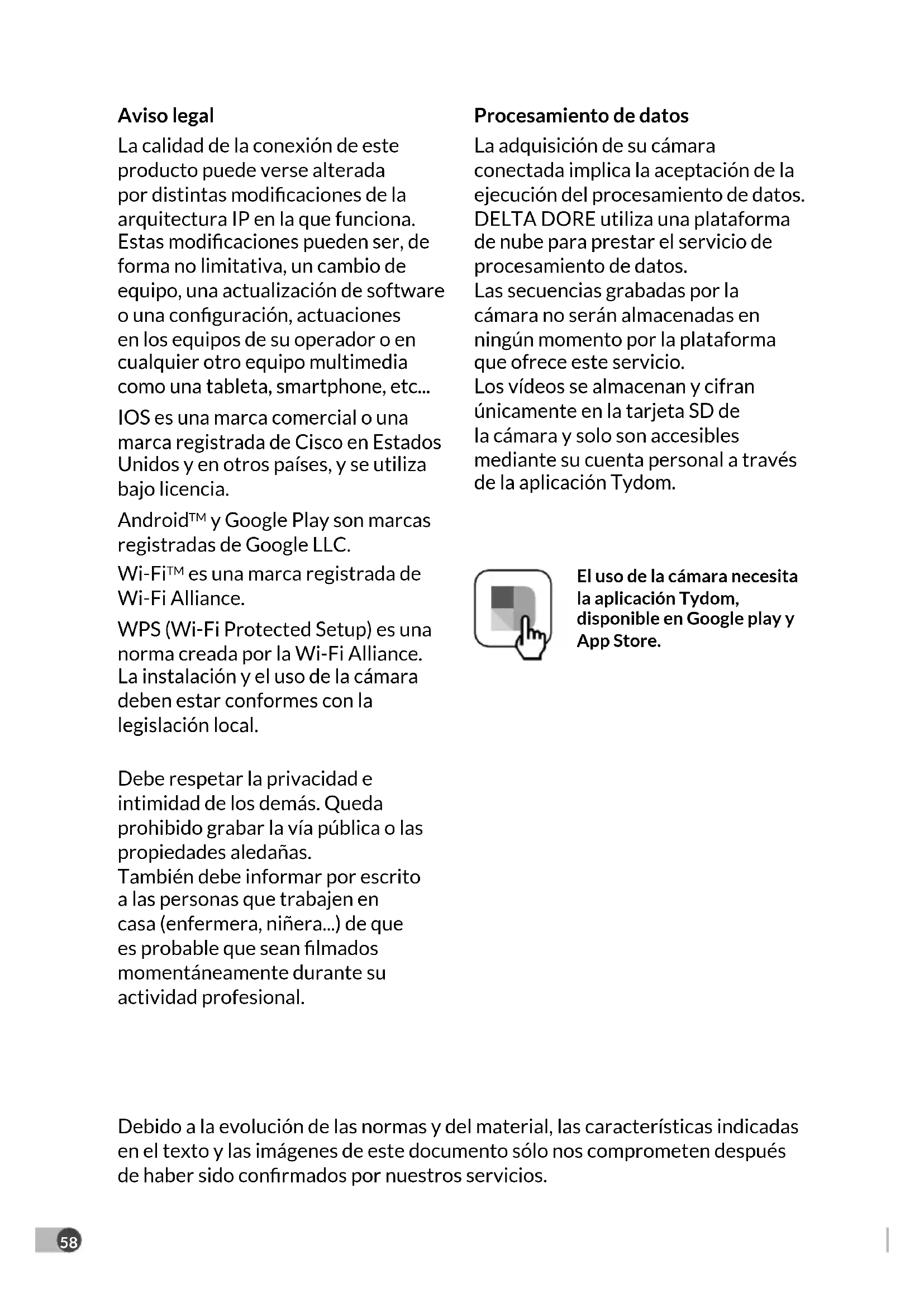 es una marca registrada de Wi-Fi Alliance. WPS (Wi-Fi Protected Setup) es una norma creada por la Wi-Fi Alliance. La instalación y el uso de la cámara deben estar conformes con la legislación local. Debe respetar la privacidad e intimidad de los demás. Queda prohibido grabar la vía pública o las propiedades aledañas. También debe informar por escrito a las personas que trabajen en casa (enfermera, niñera...) de que es probable que sean lmados momentáneamente durante su actividad profesional. Procesamiento de datos La adquisición de su cámara conectada implica la aceptación de la ejecución del procesamiento de datos. DELTA DORE utiliza una plataforma de nube para prestar el servicio de procesamiento de datos. Las secuencias grabadas por la cámara no serán almacenadas en ningún momento por la plataforma que ofrece este servicio. Los vídeos se almacenan y cifran únicamente en la tarjeta SD de la cámara y solo son accesibles mediante su cuenta personal a través de la aplicación Tydom. El uso de la cámara necesita la aplicación Tydom, disponible en Google play y App Store. Debido a la evolución de las normas y del material, las características indicadas en el texto y las imágenes de este documento sólo nos comprometen después de haber sido conrmados por nuestros servicios.59