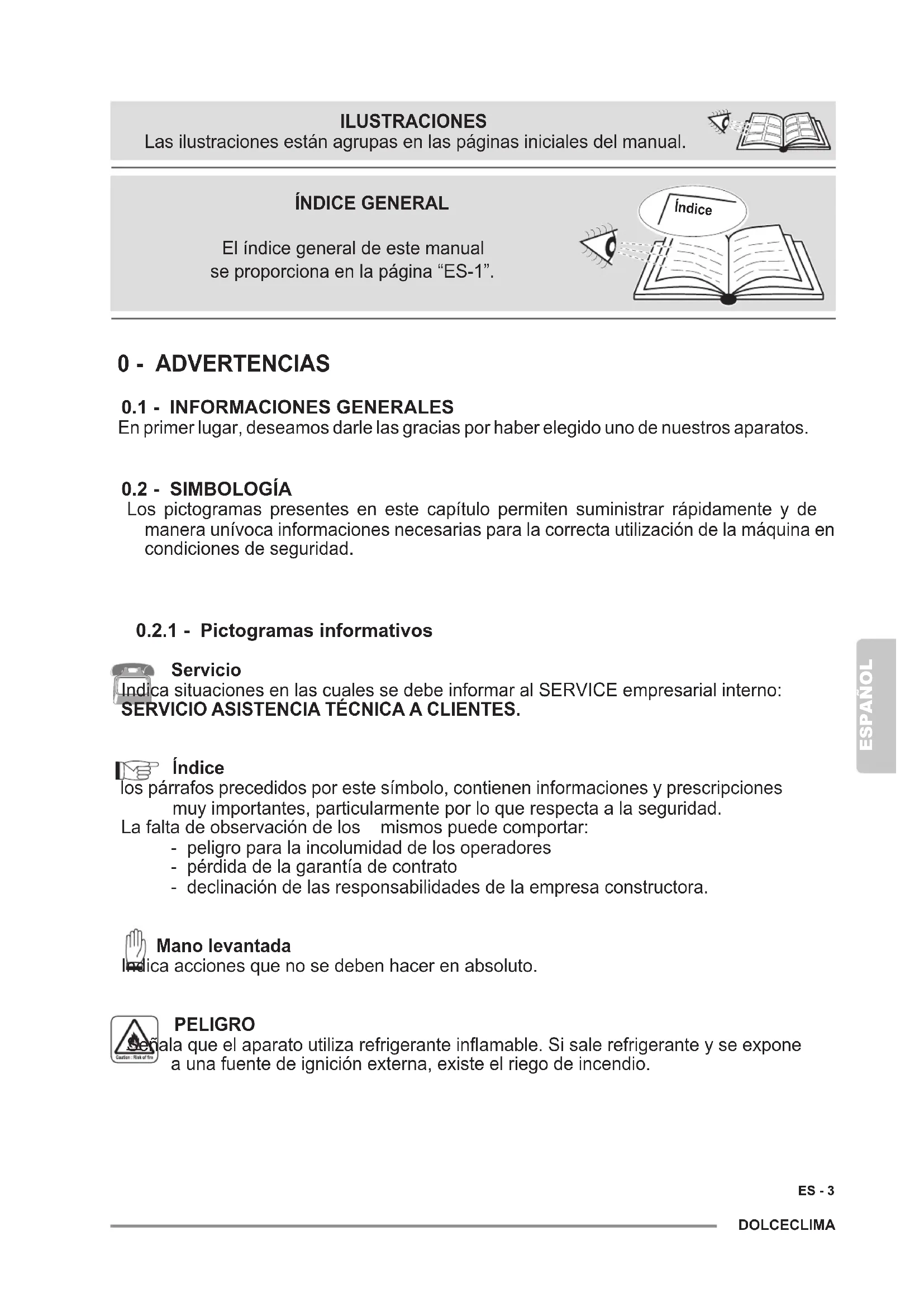 Servicio Indica situaciones en las cuales se debe informar al SERVICE empresarial interno: SERVICIO ASISTENCIA TÉCNICA A CLIENTES. Índice los párrafos precedidos por este símbolo, contienen informaciones y prescripciones muy importantes, particularmente por lo que respecta a la seguridad. La falta de observación de los mismos puede comportar: - peligro para la incolumidad de los operadores - pérdida de la garantía de contrato - declinación de las responsabilidades de la empresa constructora. Mano levantada Indica acciones que no se deben hacer en absoluto. PELIGRO Señalaqueelaparatoutilizarefrigeranteinamable.Sisalerefrigeranteyseexpone aunafuentedeigniciónexterna,existeelriegodeincendio. Índice ÍNDICE GENERAL El índice general de este manual se proporciona en la página “ES-1”. ILUSTRACIONES Las ilustraciones están agrupas en las páginas iniciales del manual.ESPAÑOL ES - 4