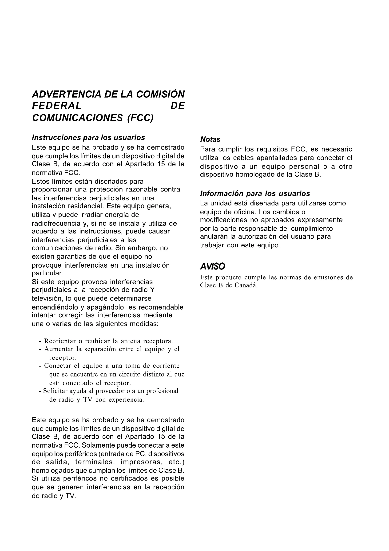 GarantieInformación para los usuarios La unidad está diseñada para utilizarse como equipo de oficina. Los cambios o modificaciones no aprobados expresamente por la parte responsable del cumplimiento anularán la autorización del usuario para trabajar con este equipo. AVISO Este producto cumple las normas de emisiones de Clase B de Canadá.