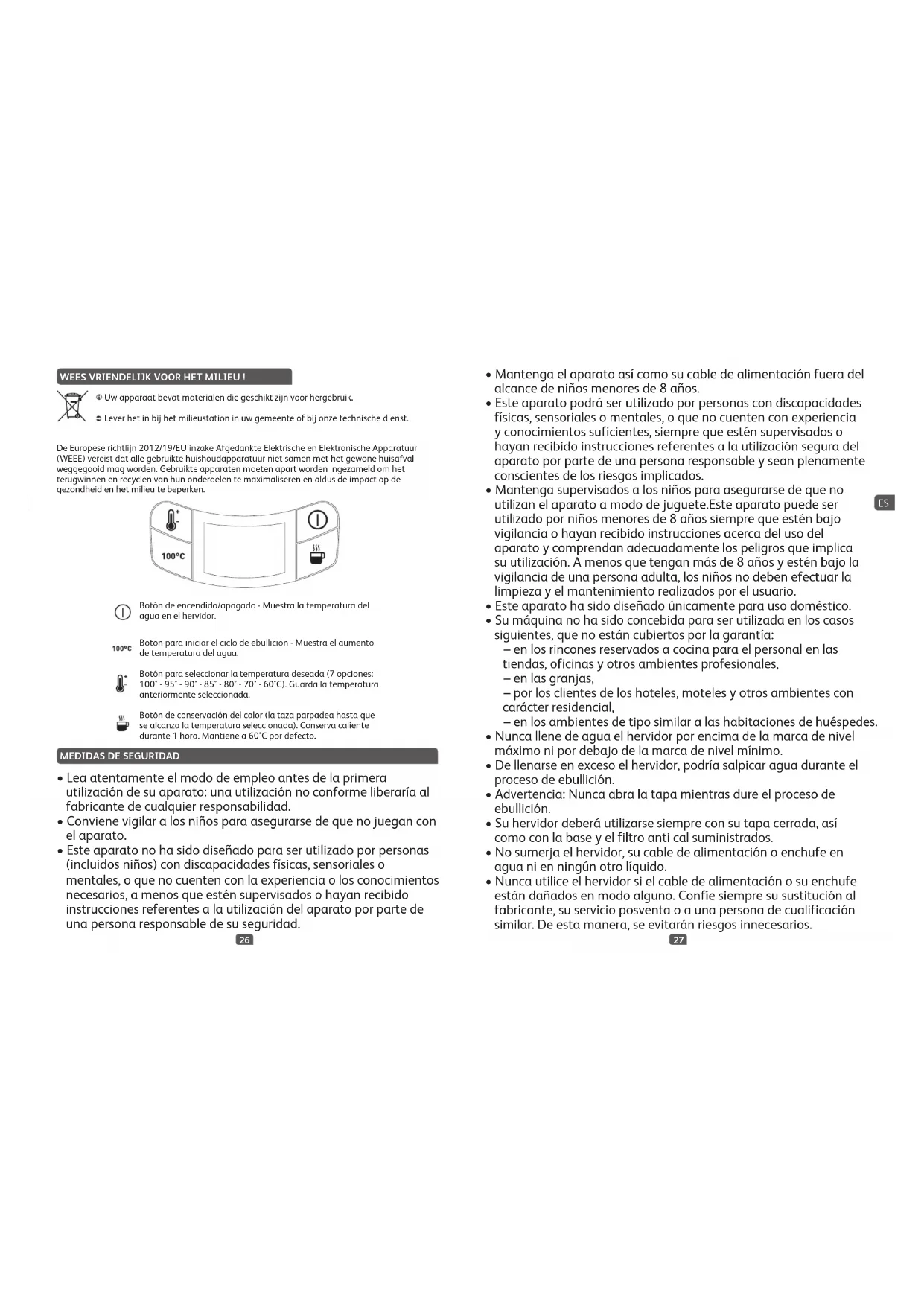 – Si desea seleccionar su temperatura (hay 7 opciones: 100° - 95° - 90° - 85° - 80° - 70° - 60°C), presione el botón hasta alcanzar la temperatura deseada. Una vez ha seleccionado la temperatura (con el botón o ), el ciclo de ebullición comenzará automáticamente al cabo de 2 segundos y se detendrá cuando se alcance la temperatura seleccionada (precisión de +/- 3°C). Si desea detener el ciclo cuando está en funcionamiento, presione el botón anterior de nuevo (el botón o ). FUNCIÓN DE CONSERVACIÓN DEL CALOR Su hervidor posee una función de conservación de calor . Si ha seleccionado una temperatura de antemano, el agua se calentará a dicha temperatura y se mantendrá a la misma temperatura durante 1 hora. Si no ha seleccionado ninguna temperatura, se mantendrá a 60°C. La temperatura máxima de la función conservación de calor es de 95°C. NOTA La pantalla se apagará automáticamente al cabo de 30 minutos (modo standby) pero todos los botones permanecerán activos. Esto significa que al presionar cualquier botón la pantalla se activa de nuevo. Si usa el botón para seleccionar una temperatura menor a la que tiene el agua del hervidor, la función no se activará y el ciclo no se iniciará. Ejemplo: Si el agua está a 90°C, no podrá iniciar un ciclo a temperaturas de 60°C/70°C/80°C/85°C. Temperaturas recomendadas: 70°C: Té blanco 80-85°C: Té verde 90°C: Café recién molido 95°C: Té negro 100°C: Agua hirviendo/infusiones