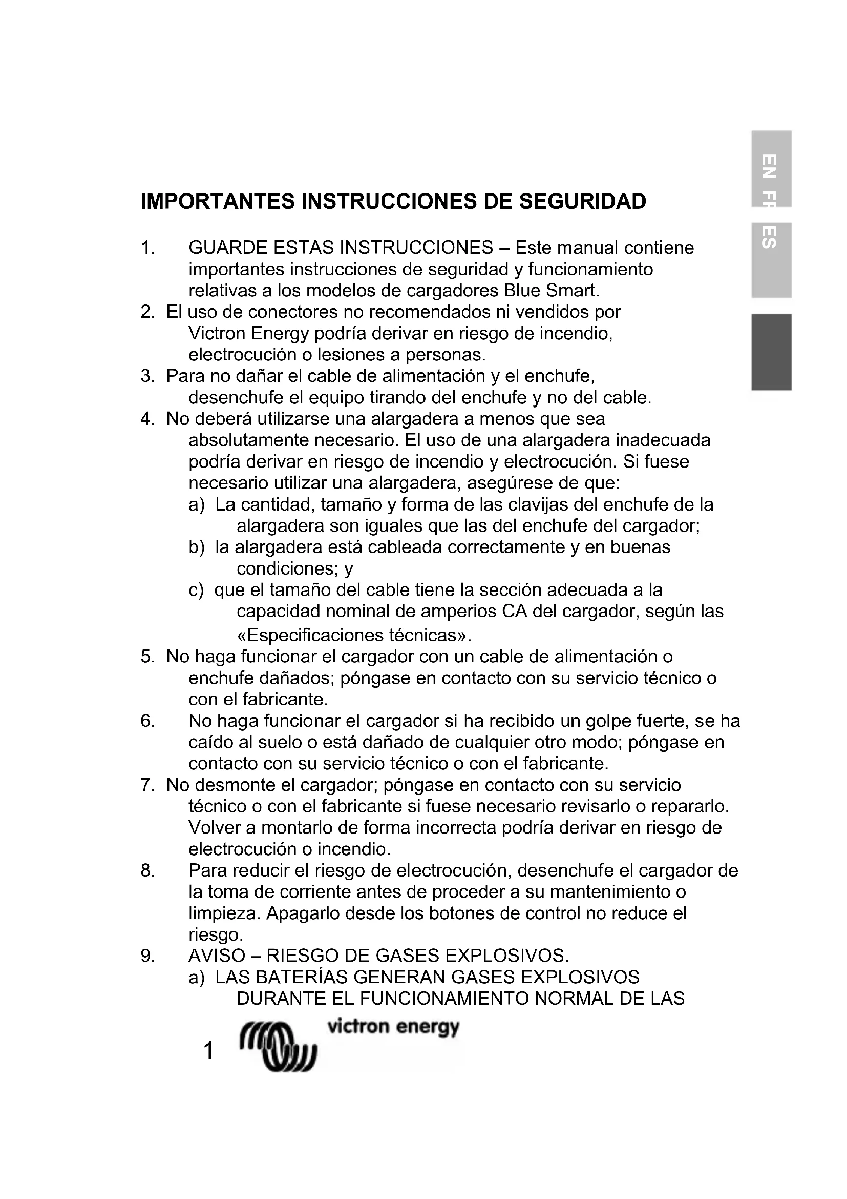 Conexión 120 V CA Cable de 1,8 metros (5,9 pies) con enchufe US NEMA 5-15 Grado de protección IP67 Peso 12/7, 12/13, 24/5: 1,8 kg (4 lbs) 12/17, 12/25, 24/8, 24/12: 2.4kg (5.3lbs) Dimensiones (al x an x p) 12/7, 12/13, 24/5: 85x211x60 mm 3,4x8,3x2,4 pulgadas 12/17, 12/25, 24/8, 24/12: 99x219x65 mm 3,9x8,6x2,6 pulgadas NORMAS Seguridad EN 60335-1, EN 60335-2-29 (UL1236 / CSA C22.2) Emisiones EN 55014-1, EN 61000-3-2 Inmunidad EN 55014-2, EN 61000-3-318 Declaración de conformidad Este dispositivo cumple con la parte 15 de las Normas de la FCC. Su funcionamiento está sujeto a las dos condiciones siguientes: (1) Este dispositivo no debe provocar interferencias perjudiciales. (2) Este dispositivo debe aceptar cualquier interferencia recibida, incluso las interferencias que puedan provocar un funcionamiento no deseado. Este dispositivo cumple con los estándares RSS exentos de licencia de Industria de Canadá. Su funcionamiento está sujeto a las dos condiciones siguientes: (1) Este dispositivo no debe provocar interferencias perjudiciales. (2) Este dispositivo debe aceptar cualquier interferencia recibida, incluso las interferencias que puedan provocar un funcionamiento no deseado. Contiene el identificador FCC: SH6MDBT40 Contiene el identificador IC: 8017A MDBT40 Rango de frecuencia: 2402 – 2480 Mhz Potencia de transmisión: -4dBm Mantenimiento El cargador Blue Smart no necesita mantenimiento. Al limpiar el cargador retire el enchufe de la toma de corriente. A continuación, utilice un trapo húmedo para limpiar el exterior.19 EN FR ES Garantía limitada de cinco años Esta garantía limitada cubre los defectos de materiales y fabricación de este producto durante un periodo de cinco años a partir de la fecha de compra original. El cliente deberá devolver el producto en el punto de compra junto con su factura correspondiente. Esta garantía limitada no cubre daños, deterioro o mal funcionamiento derivados de la alteración, modificación, uso inadecuado, no razonable o negligente; de la exposición a la humedad, fuego, embalaje inadecuado, relámpagos, subidas de tensión u otros motivos de fuerza mayor. Esta garantía limitada no cubre daños, deterioro o mal funcionamiento derivados de reparaciones realizadas por personas no autorizadas por Victron. Victron Energy no será responsable por daños consecuentes derivados del uso de este producto. La responsabilidad máxima de Victron Energy bajo esta garantía limitada no excederá el precio de compra real de este producto.Victron Energy Blue Power Distributor: