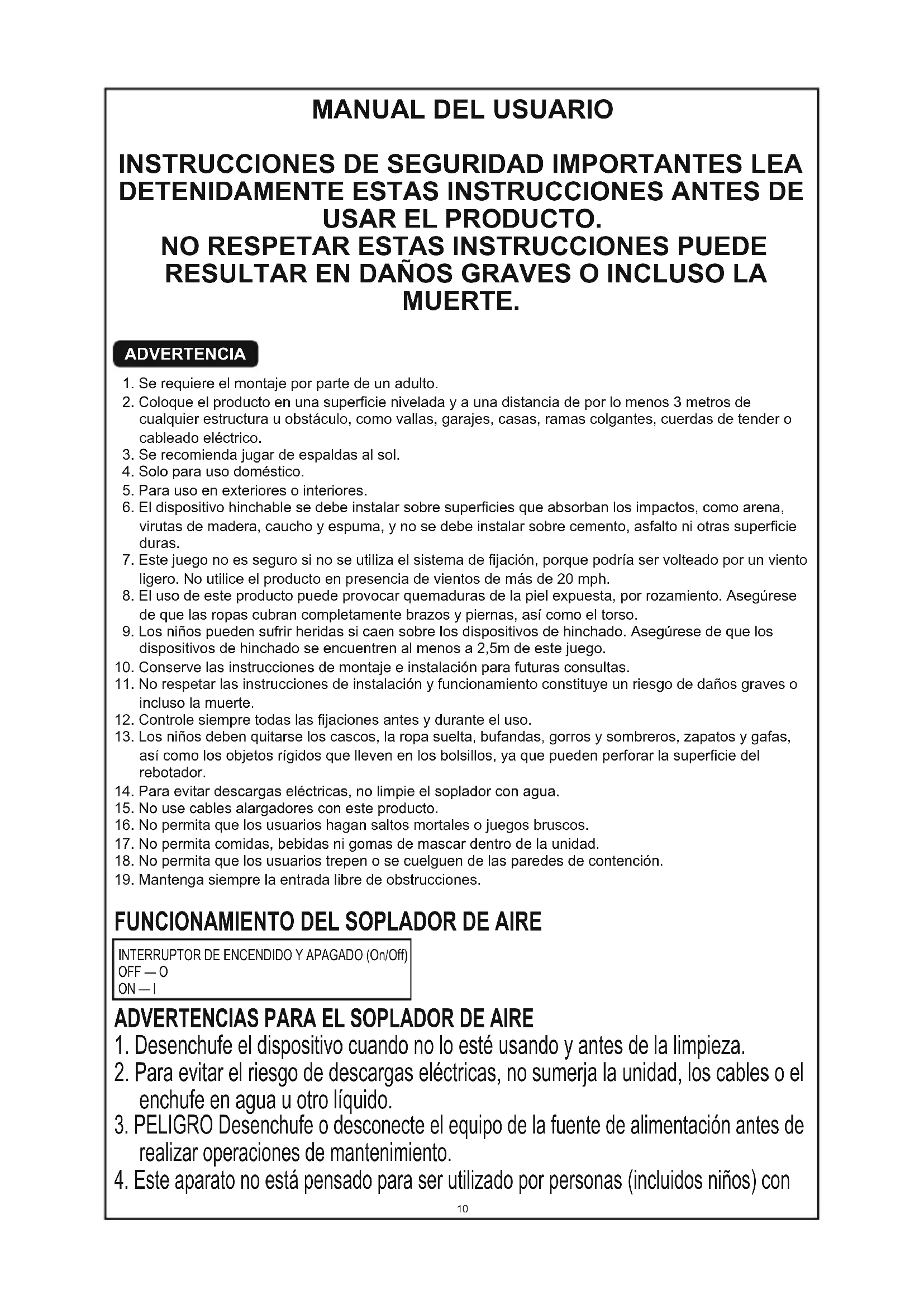 terreno para reducir los riesgos de tropiezos y caídas. Atención: Después del hinchado, el soplador de aire debe funcionar constantemente mientras los niños están jugando.