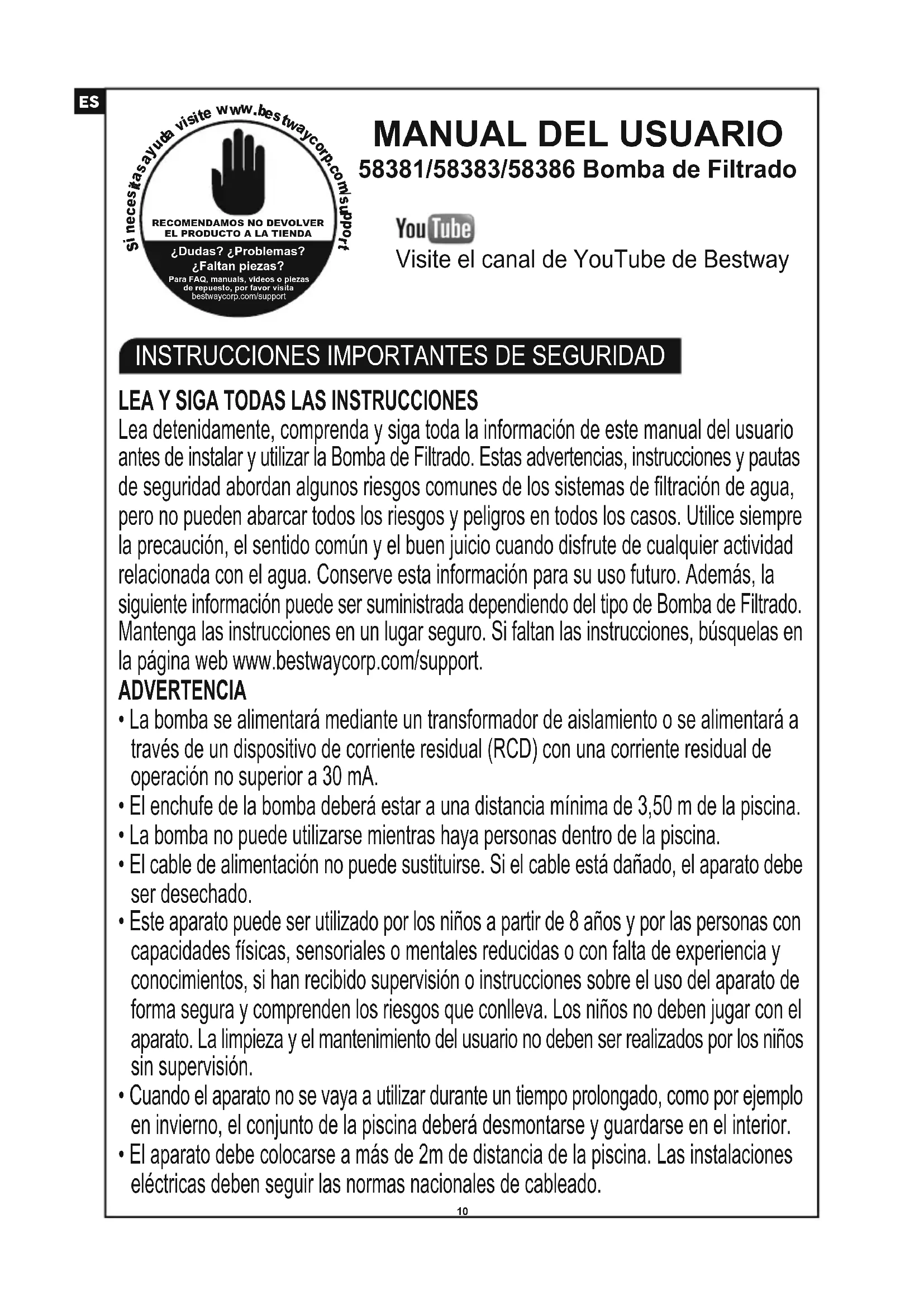 Lea detenidamente, comprenda y siga toda la información de este manual del usuario antes de instalar y utilizar la Bomba de Filtrado. Estas advertencias, instrucciones y pautas de seguridad abordan algunos riesgos comunes de los sistemas de filtración de agua, pero no pueden abarcar todos los riesgos y peligros en todos los casos. Utilice siempre la precaución, el sentido común y el buen juicio cuando disfrute de cualquier actividad relacionada con el agua. Conserve esta información para su uso futuro. Además, la siguiente información puede ser suministrada dependiendo del tipo de Bomba de Filtrado. Mantenga las instrucciones en un lugar seguro. Si faltan las instrucciones, búsquelas en la página web www.bestwaycorp.com/support. ADVERTENCIA
