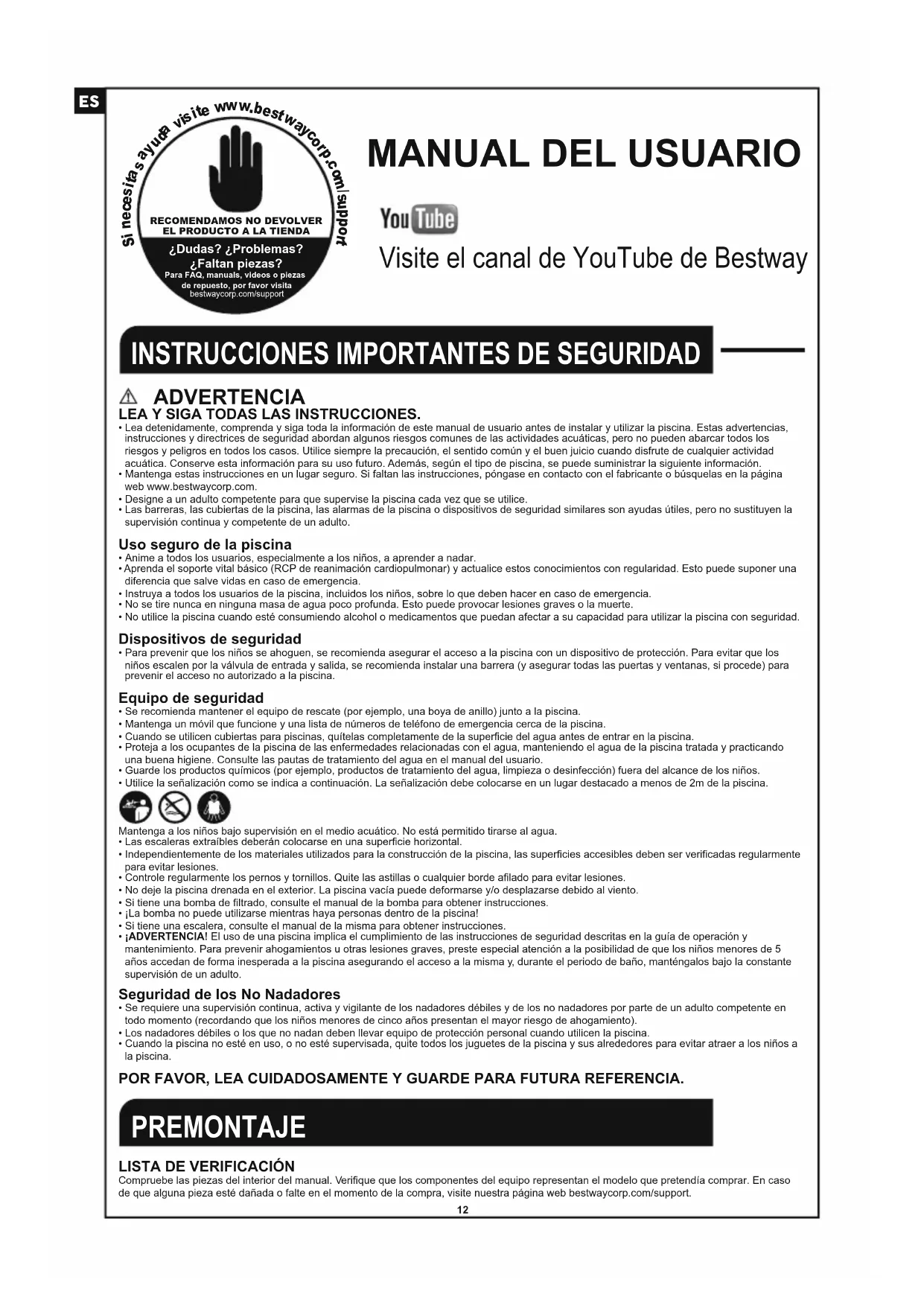 - Siga las instrucciones importantes que aparecen arriba para elegir la superficie y el lugar correctos para montar su piscina. Los daños en el conjunto de la piscina, debidos a que la superficie y la ubicación de montaje no coinciden con las instrucciones, no se considerarán como defecto de fabricación y anularán la garantía y cualquier reclamación de asistencia técnica. RECOMENDAMOS NO DEVOLVEREL PRODUCTO A LA TIENDA¿Dudas? ¿Problemas?¿Faltan piezas?Para FAQ, manuals, videos o piezasde repuesto, por favor visita bestwaycorp.com/support