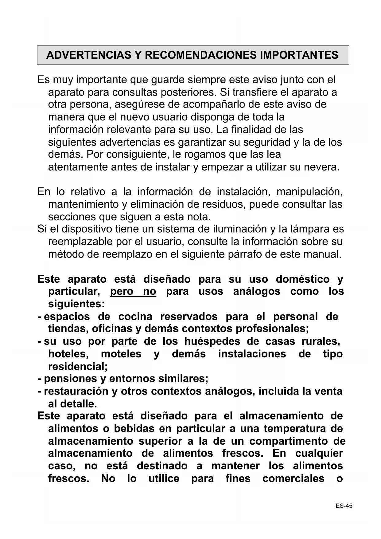 Es muy importante que guarde siempre este aviso junto con el aparato para consultas posteriores. Si transfiere el aparato a otra persona, asegúrese de acompañarlo de este aviso de manera que el nuevo usuario disponga de toda la información relevante para su uso. La finalidad de las siguientes advertencias es garantizar su seguridad y la de los demás. Por consiguiente, le rogamos que las lea atentamente antes de instalar y empezar a utilizar su nevera. En lo relativo a la información de instalación, manipulación, mantenimiento y eliminación de residuos, puede consultar las secciones que siguen a esta nota. Si el dispositivo tiene un sistema de iluminación y la lámpara es reemplazable por el usuario, consulte la información sobre su método de reemplazo en el siguiente párrafo de este manual. Este aparato está diseñado para su uso doméstico y particular, pero no para usos análogos como los siguientes: - espacios de cocina reservados para el personal de tiendas, oficinas y demás contextos profesionales; - su uso por parte de los huéspedes de casas rurales, hoteles, moteles y demás instalaciones de tipo residencial; - pensiones y entornos similares; - restauración y otros contextos análogos, incluida la venta al detalle. Este aparato está diseñado para el almacenamiento de alimentos o bebidas en particular a una temperatura de almacenamiento superior a la de un compartimento de almacenamiento de alimentos frescos. En cualquier caso, no está destinado a mantener los alimentos frescos. No lo utilice para fines comerciales o ES-45industriales ni para ningún otro propósito que no sea el que fue diseñado. Seguridad