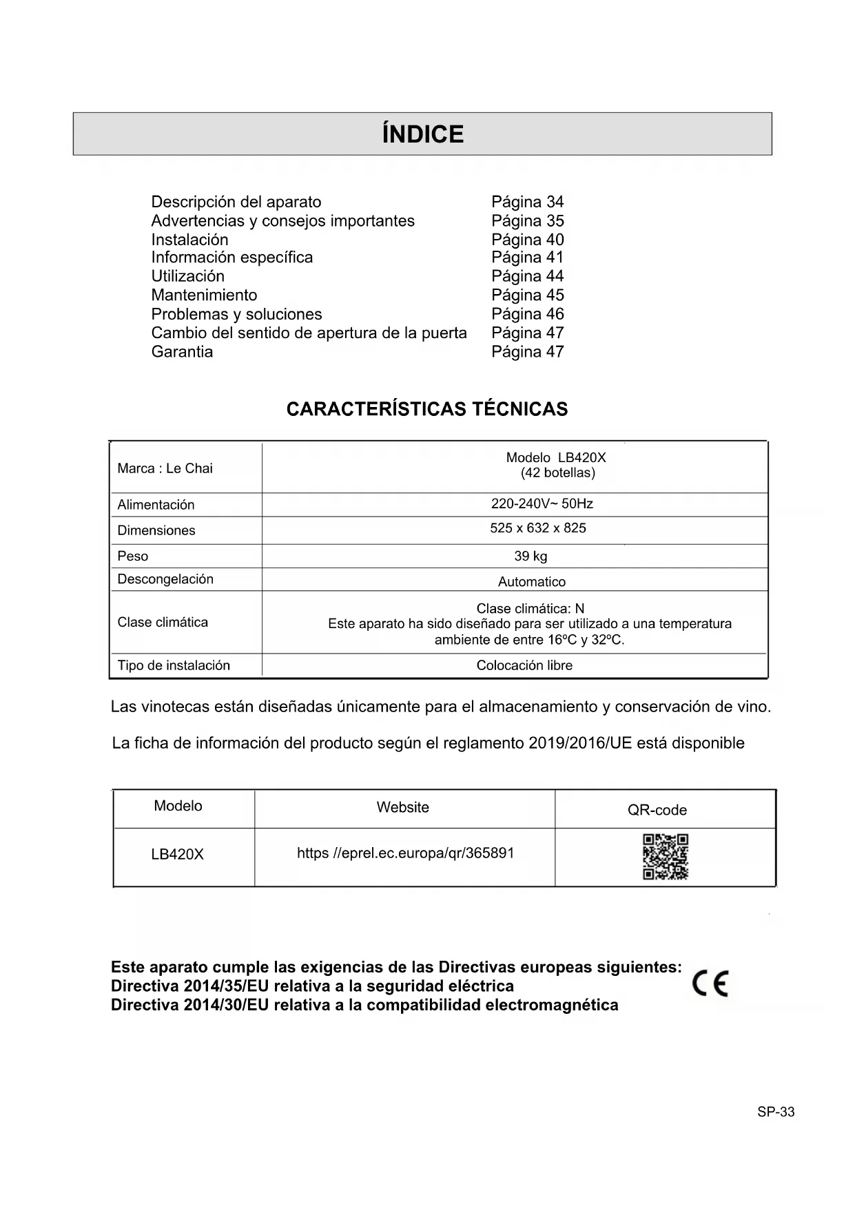 Marca : Le Chai Modelo LB420X (42 botellas) Alimentación 220-240V~ 50Hz Dimensiones 525 x 632 x 825 Peso 39 kg Descongelación Automatico Clase climática Clase climática: N Este aparato ha sido diseñado para ser utilizado a una temperatura ambiente de entre 16ºC y 32ºC. Tipo de instalación Colocación libre Las vinotecas están diseñadas únicamente para el almacenamiento y conservación de vino. La ficha de información del producto según el reglamento 2019/2016/UE está disponible Este aparato cumple las exigencias de las Directivas europeas siguientes: Directiva 2014/35/EU relativa a la seguridad eléctrica Directiva 2014/30/EU relativa a la compatibilidad electromagnética Website QR-code LB420X https //eprel.ec.europa/qr/365891 ModeloSP-34
