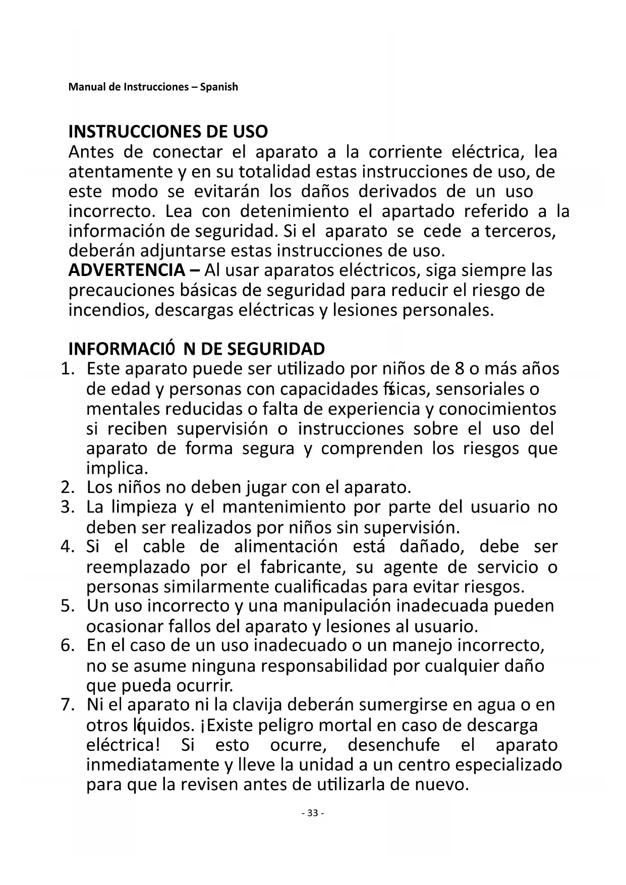 Antes de conectar el aparato a la corriente eléctrica, lea atentamente y en su totalidad estas instrucciones de uso, de este modo se evitarán los daños derivados de un uso incorrecto. Lea con detenimiento el apartado referido a la información de seguridad. Si el aparato se cede a terceros, deberán adjuntarse estas instrucciones de uso. ADVERTENCIA – Al usar aparatos eléctricos, siga siempre las precauciones básicas de seguridad para reducir el riesgo de incendios, descargas eléctricas y lesiones personales.
