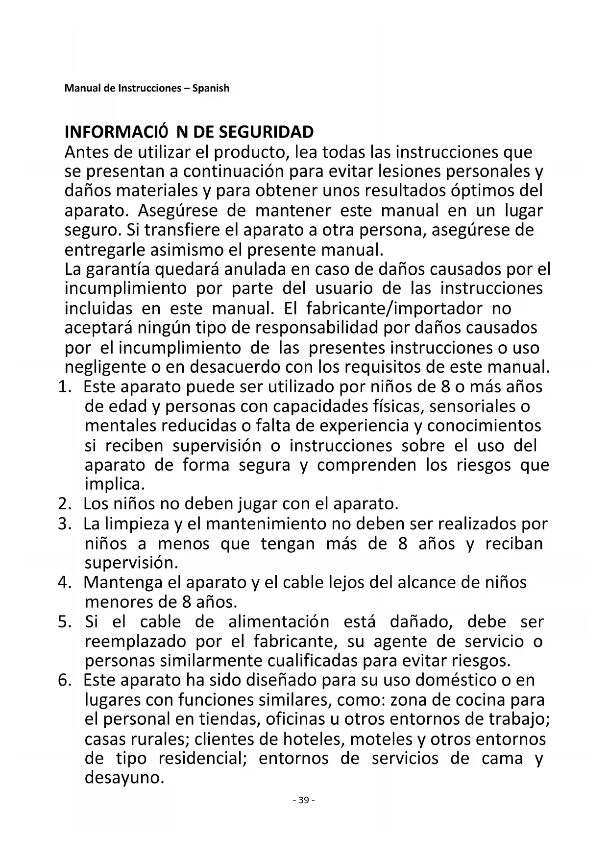 Antes de utilizar el producto, lea todas las instrucciones que se presentan a continuación para evitar lesiones personales y daños materiales y para obtener unos resultados óptimos del aparato. Asegúrese de mantener este manual en un lugar seguro. Si transfiere el aparato a otra persona, asegúrese de entregarle asimismo el presente manual. La garantía quedará anulada en caso de daños causados por el incumplimiento por parte del usuario de las instrucciones incluidas en este manual. El fabricante/importador no aceptará ningún tipo de responsabilidad por daños causados por el incumplimiento de las presentes instrucciones o uso negligente o en desacuerdo con los requisitos de este manual.