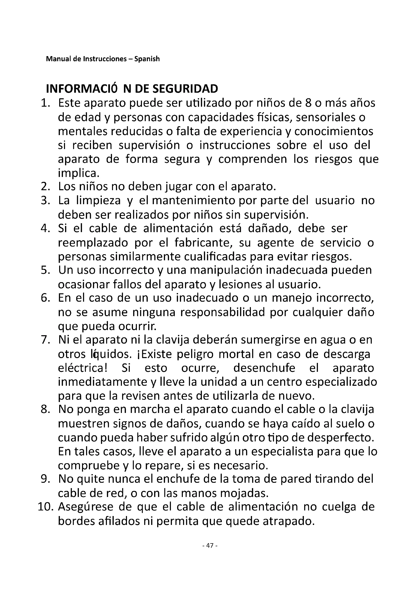 7. Ni el aparato ni la clavija deberán sumergirse en agua o en